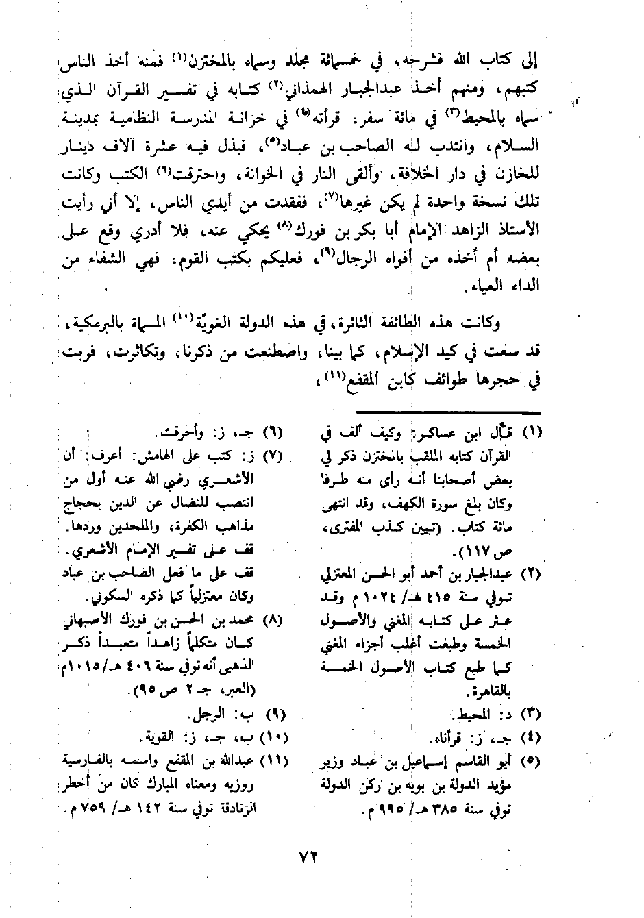 (¬2) عبد الجبار بن أحمد أبو الحسن المعتزلي توفي سنة 415 هـ/1024 م وقد عثر على كتابه المغني والأصول الخمسة وطبعت أغلب أجزاء المغني كما طبع كتاب الأصول الخمسة بالقاهرة.