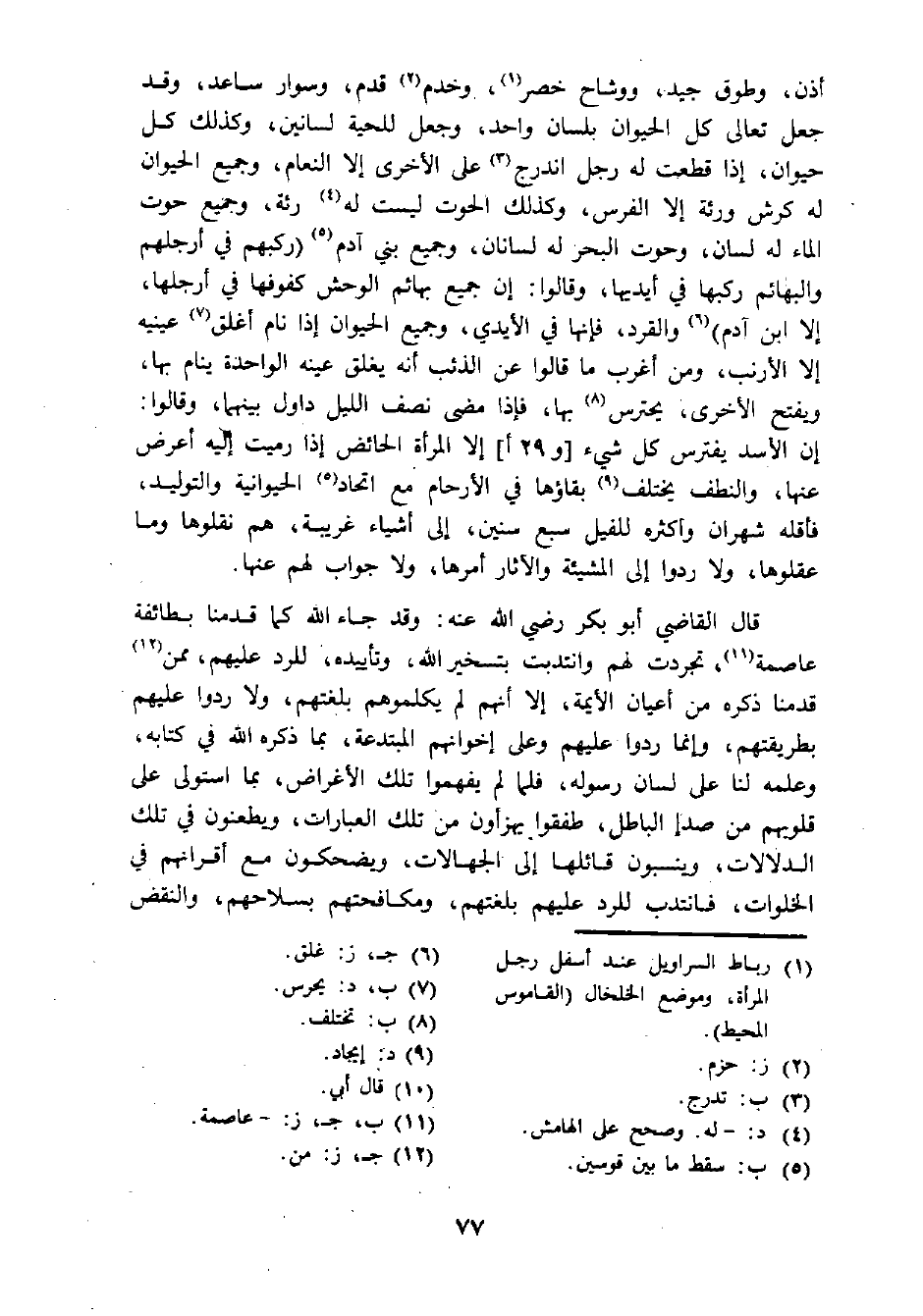 أذن، وطوق جيد، ووشاح خصر (¬1)، وخدم (¬2) قدم، وسوار ساعد، وقد جعل تعالى كل الحيوان بلسان واحد، وجعل للحية لسانين، وكذلك كل حيوان، إذا قطعت له رجل اندرج (¬3) على الأخرى إلا النعام، وجميع الحيوان له كرش ورئة إلا الفرس، وكذلك الحوت ليست له (¬4) رئة، وجميع حوت الماء له لسان، وحوت البحر له لسانان، وجميع بني آدم (¬5) (ركبهم في أرجلهم والبهائم ركبها في أيديها، وقالوا: إن جميع بهائم الوحش كفوفها في أرجلها، إلا ابن آدم) (¬6) والقرد، فإنها في الأيدي، وجميع الحيوان إذا نام أغلق (¬7) عينيه إلا الأرنب، ومن أغرب ما قالوا عن الذئب أنه يغلق عينه الواحدة ينام بها، ويفتح الأخرى، يحترس (¬8) بها، فإذا مضى نصف الليل داول بينهما، وقالوا: إن الأسد يفترس كل شيء [و 29 أ]، إلا المرأة الحاثض إذا رميت إليه أعرض عنها، والنطف يختلف (¬9) بقاؤها في الأرحام مع اتحاد (¬10) الحيوانية والتوليد، فأقله شهران وأكثره للفيل سبع سنين، إلى أشياء غريبة، هم نقلوها وما عقلوها، ولا ردوا إلى المشيئة والآثار أمرها، ولا جواب لهم عنها.