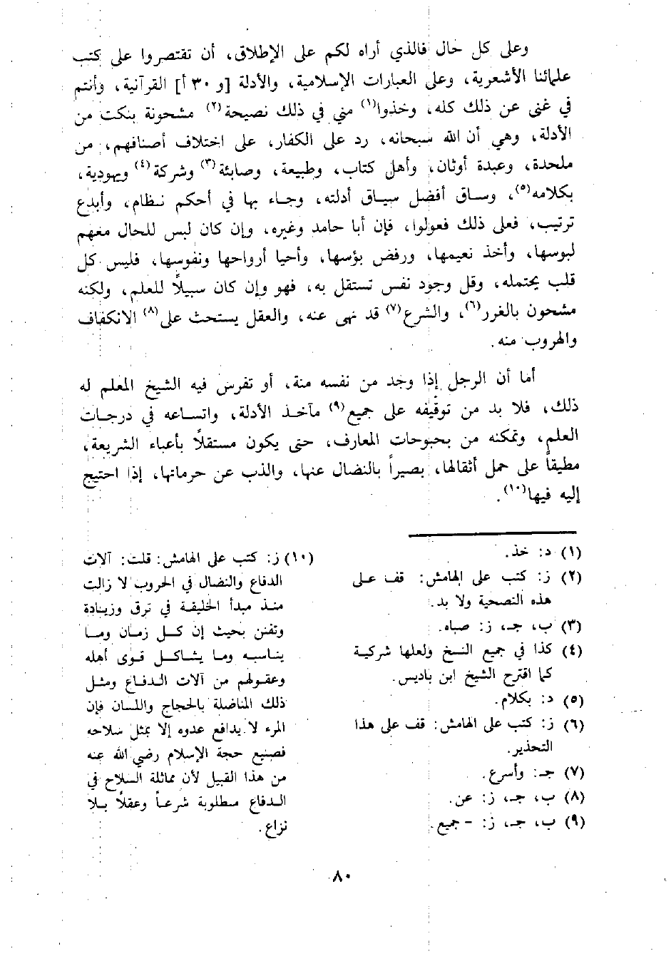 (¬10) ز: كتب على الهامش: قلت: آلات الدفاع والنضال في الحروب لا زالت منذ مبدأ الخليقة في ترق وزيادة وتفنن بحيث إن كل زمان وما يناسبه وما يشاكل قوى أهله وعقولهم من آلات الدفاع ومثل ذلك المناضلة بالحجاج واللسان فإن المرء لا يدافع عدوه إلا بمثل سلاحه فصنيع حجة الإسلام رضي الله عنه من هذا القبيل لأن مماثلة السلاح في الدفاع مطلوبة شرعا وعقلا بلا نزاع.