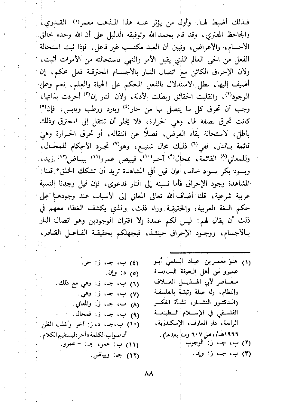 (¬1) هو معمر بن عباد السلمي أبو عمرو من أهل الطبقة السادسة معاصر لأبي الهذيل العلاف والنظام، وله صلة وثيقة بالفلسفة (الدكتور النشار، نشاة الفكر الفلسفي في الإسلام الطبعة الرابعة، دار المعارف، الإسكندرية، 1966هـ/، ص 607 وما بعدها).