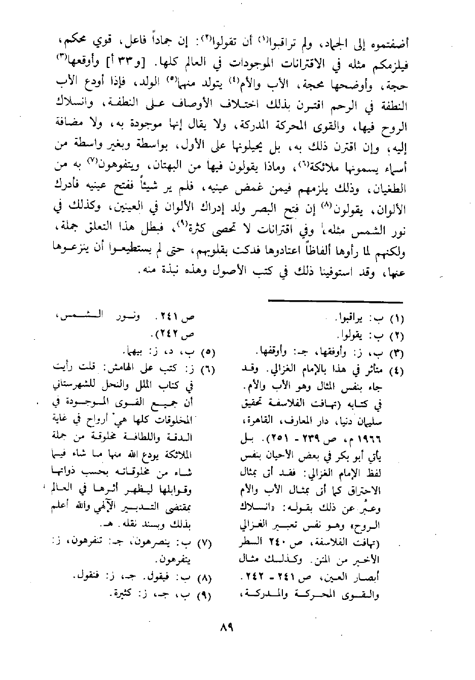 (¬4) متأثر في هذا بالإمام الغزالي. وقد جاء بنفس المثال وهو الأب والأم. في كتابه (تهافت الفلاسفة تحقيق سليمان دنيا، دار المعارف، القاهرة، 1966 م، ص 239 - 251). بل يأتي أبو بكر في بعض الأحيان بنفس لفظ الإمام الغزالي: فقد أتى بمثال الاحتراق كما أتى بمثال الأب والأم وعبر عن ذلك بقوله: "انسلاك الروح" وهو نفس تعبير الغزالي (تهافت الفلاسفة، ص 245 السطر الأخير من المتن. وكذلك مثال أبصار العين، ص 241 - 242. والقوى المحركة والمدركة، ص 241. ونور الشمس، ص 242).