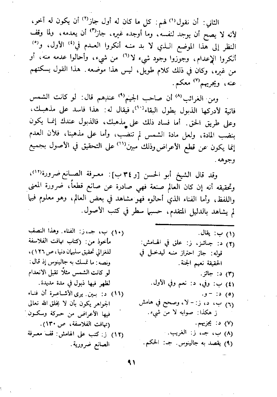 (¬10) ب، ج، ز: الفناء. وهذا النصف مأخوذ من: (كتاب تهافت الفلاسفة للغزالي تحقيق سليمان دنيا، ص 126)، ونصه: ما تمسك به جالينوس إذ قال: لو كانت الشمس مثلا تقبل الانعدام لظهر فيها ذبول في مدة مديدة.
