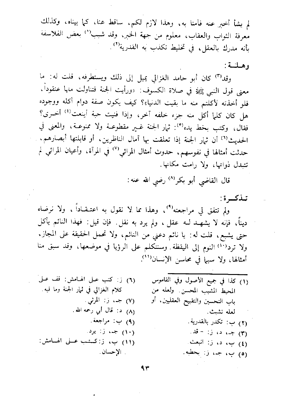 وقد (¬3) كان أبو حامد الغزالي يميل إلى ذلك ويستطرفه، قلت له: ما معنى قول النبي - صلى الله عليه وسلم - في صلاة الكسوف: "ورأيت الجنة فتناولت منها عنقودا، فلو أخذته لأكلتم منه ما بقيت الدنيا"؟ كيف يكون صفة دوام أكله ووجوده هل كان كلما أكل منه جزء خلفه آخر، وإذا فنيت حبة أينعت (¬4) أخرى؟ فقال، وكتب بخط يده (¬5): ثمار الجنة غير مقطوعة ولا ممنوعة، والمعنى في الحديث (¬6) أن ثمار الجنة إذا تعلقت بها آمال الناظرين، أو قابلتها أبصارهم، حدثت أمثالها في نفوسهم، حدوث أمثال المرائي (¬7) في المرآة، وأعيان المرائي لم تتبدل ذواتها، ولا رامت مكانها.