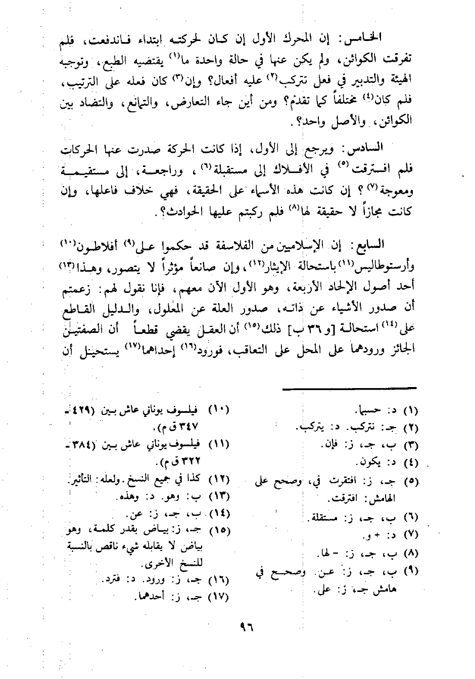 الخامس: إن المحرك الأول إن كان لحركته ابتداء فاندفعت، فلم تفرقت الكوائن، ولم يكن عنها في حالة واحدة ما (¬1) يقتضيه الطبع، وتوجبه الهيئة والتدبير في فعل تتركب (¬2) عليه أفعال؟ وإن (¬3) كان فعله على الترتيب، فلم كان (¬4) مختلفا كما تقدم؟ ومن أين جاء التعارض، والتمانع، والتضاد بين الكوائن، والأصل واحد؟.