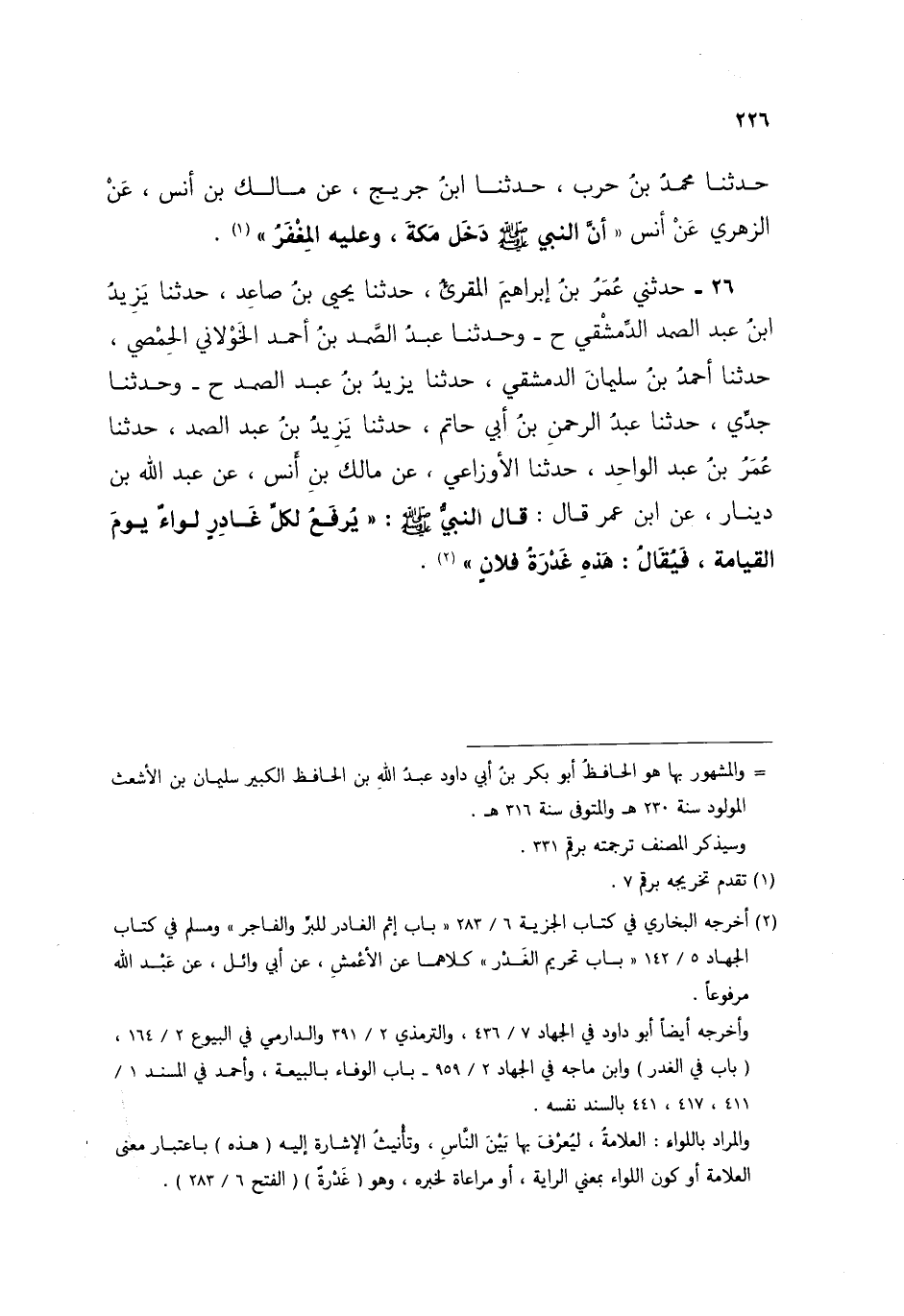 26 - حَدَّثَنِي عُمَرُ بْنُ إِبْرَاهِيمَ الْمُقْرِئُ، حَدَّثَنَا يَحْيَى بْنُ صَاعِدٍ، حَدَّثَنَا يَزِيدُ بْنُ عَبْدِ الصَّمَدِ الدِّمَشْقِيُّ، ح وَحَدَّثَنَا عَبْدُ الصَّمَدِ بْنُ أَحْمَدَ الْخَوْلَانِيُّ الْحِمْصِيُّ، حَدَّثَنَا أَحْمَدُ بْنُ سُلَيْمَانَ الدِّمَشْقِيُّ، حَدَّثَنَا يَزِيدُ بْنُ عَبْدِ الصَّمَدِ، ح وَحَدَّثَنَا جَدِّي، حَدَّثَنَا عَبْدُ الرَّحْمَنِ بْنُ أَبِي حَاتِمٍ، حَدَّثَنَا يَزِيدُ بْنُ عَبْدِ الصَّمَدِ، حَدَّثَنَا عُمَرُ بْنُ عَبْدِ الْوَاحِدِ، حَدَّثَنَا الْأَوْزَاعِيُّ، عَنْ مَالِكِ بْنِ أَنَسٍ، عَنْ عَبْدِ اللَّهِ بْنِ دِينَارٍ، عَنِ ابْنِ عُمَرَ، قَالَ: قَالَ النَّبِيُّ صَلَّى اللهُ عَلَيْهِ وَسَلَّمَ: " §يُرْفَعُ لِكُلِّ غَادِرٍ لِوَاءٌ يَوْمَ الْقِيَامَةِ , فَيُقَالُ: هَذِهِ غَدْرَةُ فُلَانٍ "