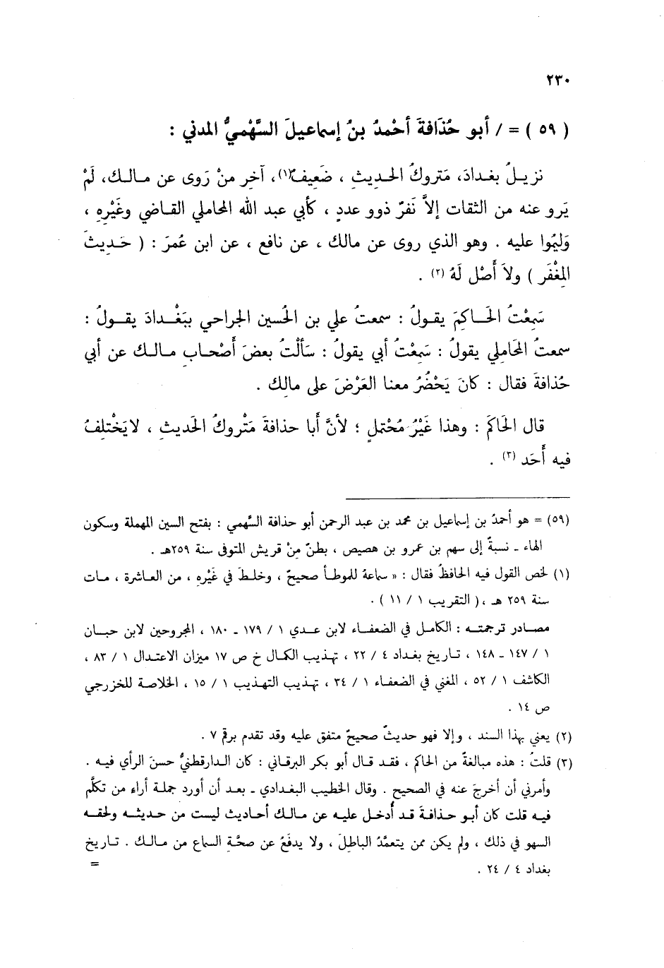 §أَبُو حُذَافَةَ أَحْمَدُ بْنُ إِسْمَاعِيلَ السَّهْمِيُّ الْمَدَنِيُّ نَزِيلُ بَغْدَادَ , مَتْرُوكُ الْحَدِيثِ , ضَعِيفٌ , آخِرُ مَنْ رَوَى عَنْ مَالِكٍ , لَمْ يَرْوِ عَنْهُ مِنَ الثِّقَاتِ إِلَّا نَفَرٌ ذَوُو عَدَدٍ , كَأَبِي عَبْدِ اللَّهِ الْمَحَامِلِيِّ الْقَاضِي , وَغَيْرِهِ وَلِيمُوا عَلَيْهِ , وَهُوَ الَّذِي رَوَى عَنْ مَالِكٍ , عَنْ نَافِعٍ , عَنِ ابْنِ عُمَرَ حَدِيثَ الْمِغْفَرِ , وَلَا أَصْلَ لَهُ. سَمِعْتُ الْحَاكِمَ يَقُولُ: سَمِعْتُ عَلِيَّ بْنَ الْحُسَيْنِ الْجَرَّاحِيَّ بِبَغْدَادَ يَقُولُ: سَمِعْتُ الْمَحَامِلِيَّ يَقُولُ: سَمِعْتُ أَبِي يَقُولُ: سَأَلْتُ بَعْضَ أَصْحَابِ مَالِكٍ عَنْ أَبِي حُذَافَةَ , فَقَالَ: كَانَ يَحْضُرُ مَعَنَا الْعَرْضَ عَلَى مَالِكٍ قَالَ الْحَاكِمُ: وَهَذَا غَيْرُ مُحْتَمَلٌ؛ لِأَنَّ أَبَا حُذَافَةَ مَتْرُوكُ الْحَدِيثِ , لَا يَخْتَلِفُ فِيهِ أَحَدٌ