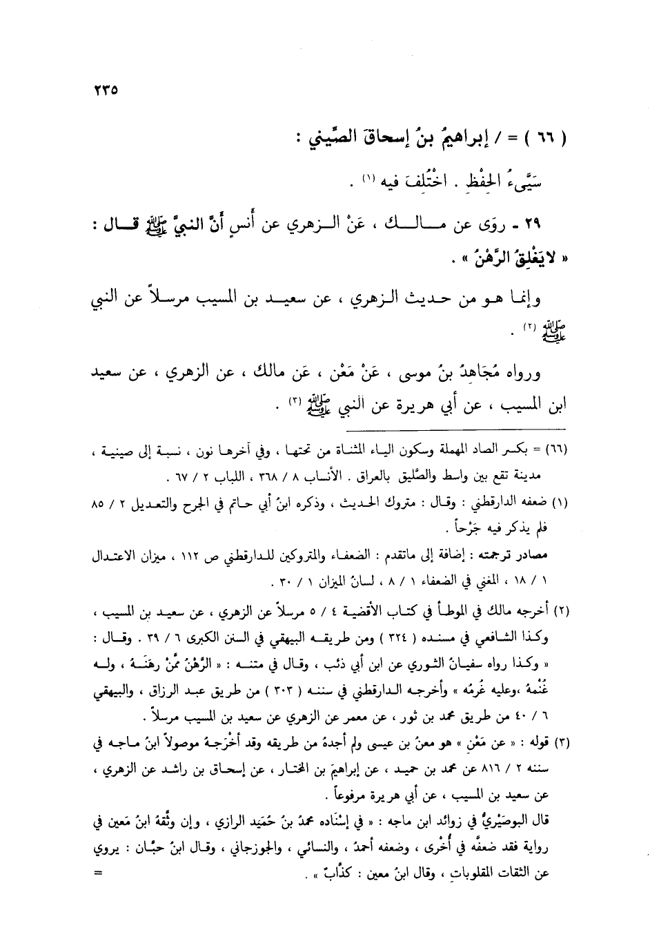 29 - رَوَى عَنْ مَالِكٍ عَنِ الزُّهْرِيِّ عَنْ أَنَسٍ أَنَّ النَّبِيَّ صَلَّى اللهُ عَلَيْهِ وَسَلَّمَ قَالَ: «لَا يَغْلِقُ الرَّهْنُ» . وَإِنَّمَا هُوَ مِنْ حَدِيثِ الزُّهْرِيِّ , عَنْ سَعِيدِ بْنِ الْمُسَيِّبِ مُرْسَلًا عَنِ النَّبِيِّ صَلَّى اللهُ عَلَيْهِ وَسَلَّمَ , وَرَوَاهُ مُجَاهِدُ بْنُ مُوسَى , عَنْ مَعْنٍ , عَنْ مَالِكٍ , عَنِ الزُّهْرِيِّ , عَنْ سَعِيدِ بْنِ الْمُسَيِّبِ , عَنْ أَبِي هُرَيْرَةَ , عَنِ النَّبِيِّ صَلَّى اللهُ عَلَيْهِ وَسَلَّمَ