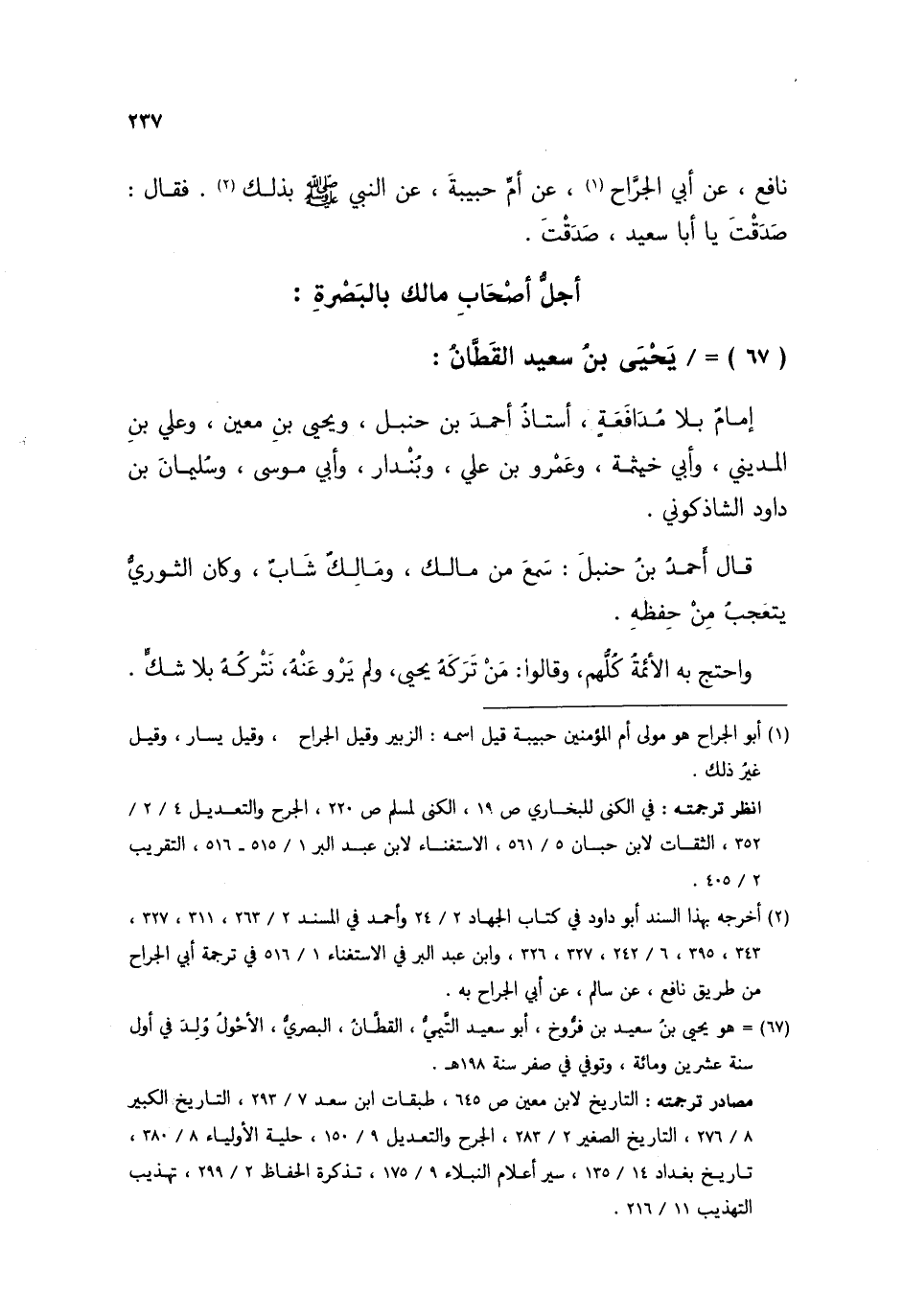 §يَحْيَى بْنُ سَعِيدٍ الْقَطَّانُ إِمَامٌ بِلَا مُدَافَعَةٍ , أُسْتَاذُ أَحْمَدَ بْنِ حَنْبَلٍ , وَيَحْيَى بْنِ مَعِينٍ , وَعَلِيِّ بْنِ الْمَدِينِيِّ , وَأَبِي خَيْثَمَةَ، وَعَمْرِو بْنِ عَلِيٍّ , وَبُنْدَارٍ , وَأَبِي مُوسَى , وَسُلَيْمَانَ بْنِ دَاوُدَ الشَّاذَكُونِيِّ. قَالَ أَحْمَدُ بْنُ حَنْبَلٍ: سَمِعَ مِنَ مَالِكٍ , وَمَالِكٌ شَابٌّ , وَكَانَ الثَّوْرِيُّ يَتَعَجَّبُ مِنْ حِفْظِهِ , وَاحْتَجَّ بِهِ الْأَئِمَّةُ كُلُّهُمْ , وَقَالُوا: مَنْ تَرَكَهُ يَحْيَى , وَلَمْ يَرْوِ عَنْهُ , نَتْرُكْهُ بِلَا شَكٍّ