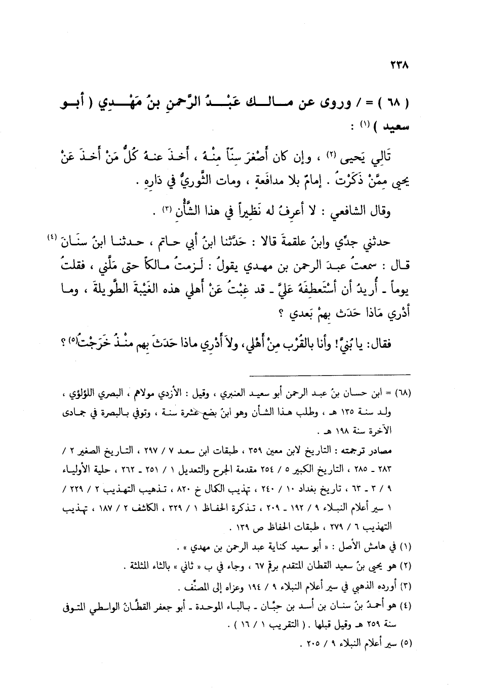 وَرَوَى عَنْ مَالِكٍ §عَبْدُ الرَّحْمَنِ بْنُ مَهْدِيِّ أَبِي سَعِيدٍ تَالِي يَحْيَى , وَإِنْ كَانَ أَصْغَرَ سِنًّا مِنْهُ , أَخَذَ عَنْهُ كُلُّ مَنْ أَخَذَ عَنْ يَحْيَى مِمَّنْ ذَكَرْتُ , إِمَامٌ بِلَا مُدَافَعَةٍ , وَمَاتَ الثَّوْرِيُّ فِي دَارِهِ , وَقَالَ الشَّافِعِيُّ: لَا أَعْرِفُ لَهُ نَظِيرًا فِي هَذَا الشَّأْنِ , حَدَّثَنِي جَدِّي , وَابْنُ عَلْقَمَةَ قَالَا: حَدَّثَنَا ابْنُ أَبِي حَاتِمٍ , حَدَّثَنَا ابْنُ سِنَانٍ , قَالَ: سَمِعْتُ عَبْدَ الرَّحْمَنِ بْنَ مَهْدِيٍّ يَقُولُ: لَزِمْتُ مَالِكًا حَتَّى مَلَّنِي , فَقُلْتُ يَوْمًا: أُرِيدُ أَنْ أَسْتَعْطِفَهُ عَلِيَّ , قَدْ غِبْتُ عَنْ أَهْلِي هَذِهِ الْغِيبَةَ الطَّوِيلَةَ , وَمَا أَدْرِي مَاذَا حَدَثَ بِهِمْ بَعْدِي؟ فَقَالَ يَا بُنَيَّ وَأَنَا بِالْقُرْبِ مِنْ أَهْلِي وَلَا أَدْرِي مَاذَا حَدَثَ بِهِمْ مُنْذُ خَرَجْتُ؟