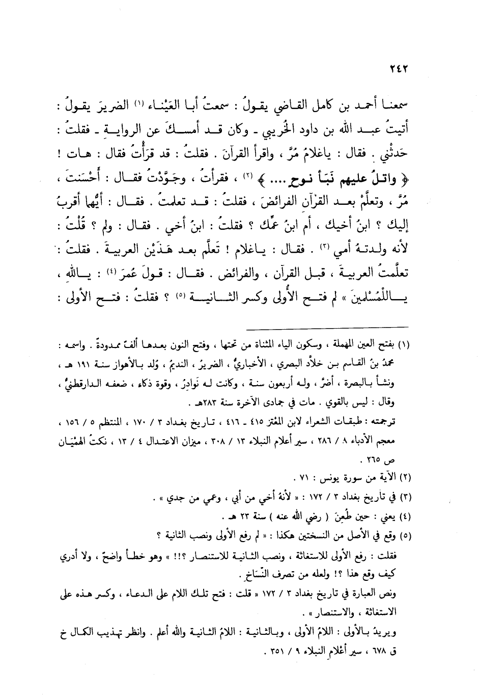 : سَمِعْنَا أَحْمَدَ بْنَ كَامِلٍ الْقَاضِي يَقُولُ: سَمِعْتُ أَبَا الْعَيْنَاءِ الضَّرِيرَ، يَقُولُ: أَتَيْتُ عَبْدَ اللَّهِ بْنَ دَاوُدَ الْخُرَيْبِيَّ , وَكَانَ قَدْ أَمْسَكَ عَنِ الرِّوَايَةِ , فَقُلْتُ: حَدِّثْنِي. فَقَالَ: يَا غُلَامُ , مُرَّ , وَأَقْرَأِ الْقُرْآنَ. فَقُلْتُ: قَدْ قَرَأْتُ. فَقَالَ: هَاتِ: {وَاتْلُ عَلَيْهِمْ نَبَأَ نُوحٍ. . .} [يونس: 71] فَقَرَأْتُ وَجَوَّدْتُ. فَقَالَ: أَحْسَنْتَ , مُرَّ , وَتَعَلَّمْ بَعْدَ الْقُرْآنِ الْفَرَائِضَ. فَقُلْتُ: قَدْ تَعَلَّمْتُ. فَقَالَ: أَيُّهُمَا أَقْرَبُ إِلَيْكَ: ابْنُ أَخِيكَ أَمِ ابْنُ عَمِّكَ؟ فَقُلْتُ: ابْنُ أَخِي. فَقَالَ: وَلِمَ؟ قُلْتُ: لِأَنَّهُ وَلَدَتْهُ أُمِّي. فَقَالَ: يَا غُلَامُ , تَعَلَّمْ بَعْدَ هَذَيْنِ الْعَرَبِيَّةَ. فَقُلْتُ: تَعَلَّمْتُ الْعَرَبِيَّةَ قَبْلَ الْقُرْآنِ وَالْفَرَائِضِ. فَقَالَ قَوْلَ عُمَرَ: يَا لَلَّهِ، يَا لِلْمُسْلِمِينَ، لِمَ فَتَحَ الْأُولَى وَكَسَرَ الثَّانِيَةَ؟ فَقُلْتُ: فَتَحَ الْأُولَى -[243]- لِلِاسْتِغَاثَةِ , وَكَسَرَ الثَّانِيَةَ لِلِاسْتِنْصَارِ. فَقَالَ: يَا غُلَامُ , لَوْ كُنْتُ مُحَدِّثًا أَحَدًا لَحَدَّثْتُكَ