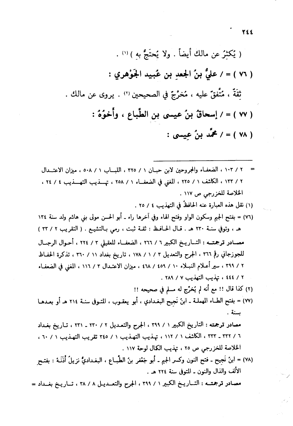 §إِسْحَاقُ بْنُ عِيسَى بْنِ الطَّبَّاعِ وَأَخُوهُ مُحَمَّدُ بْنُ عِيسَى -[245]- مُتَّفَقٌ عَلَيْهِمَا , ثِقَتَانِ , رَوَيَا عَنْ مَالِكٍ