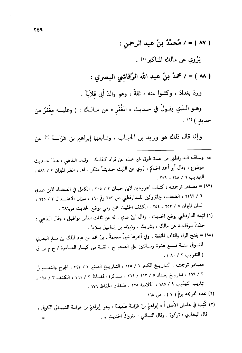 §مُحَمَّدُ بْنُ عَبْدِ اللَّهِ الرَّقَاشِيُّ الْبَصْرِيُّ وَرَدَ بَغْدَادَ , وَكَتَبُوا عَنْهُ , ثِقَةٌ , وَهُوَ وَالِدُ أَبِي قِلَابَةَ , وَهُوَ الَّذِي يَقُولُ فِي حَدِيثِ الْمِغْفَرِ عَنْ مَالِكٍ: وَعَلَيْهِ مِغْفَرٌ مِنْ حَدِيدٍ. وَإِنَّمَا قَالَ ذَلِكَ هُوَ وَزَيْدُ بْنُ الْحُبَابِ , وَتَابَعَهُمَا إِبْرَاهِيمُ بْنُ هَرَاسَةَ , عَنْ -[250]- سُفْيَانَ بْنِ بَشِيرٍ , وَأَبِي عُبَيْدٍ الْقَاسِمُ بْنُ سَلَّامٍ , عَنْ يَحْيَى بْنِ عَبْدِ اللَّهِ بْنِ بُكَيْرٍ