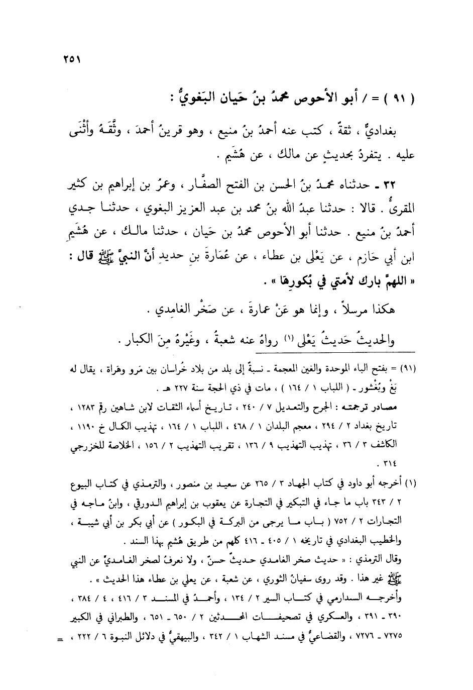 32 - حَدَّثَنَاهُ مُحَمَّدُ بْنُ الْحَسَنِ بْنِ الْفَتْحِ الصَّفَّارُ، وَعُمَرُ بْنُ إِبْرَاهِيمَ بْنِ كَثِيرٍ الْمُقْرِئُ، قَالَا: حَدَّثَنَا عَبْدُ اللَّهِ بْنُ مُحَمَّدِ بْنِ عَبْدِ الْعَزِيزِ الْبَغَوِيُّ، حَدَّثَنَا جَدِّي أَحْمَدُ بْنُ مَنِيعٍ , حَدَّثَنَا أَبُو الْأَحْوَصِ مُحَمَّدُ بْنُ حَيَّانَ , حَدَّثَنَا مَالِكٌ، عَنْ هُشَيْمِ بْنِ أَبِي حَازِمٍ، عَنْ يَعْلَى بْنِ عَطَاءٍ، عَنْ عُمَارَةَ بْنِ حَدِيدٍ، أَنَّ النَّبِيَّ صَلَّى اللهُ عَلَيْهِ وَسَلَّمَ قَالَ: «اللَّهُمَّ §بَارِكْ لِأُمَّتِي فِي بُكُورِهَا» هَكَذَا مُرْسَلًا , وَإِنَّمَا هُوَ عَنْ عُمَارَةَ , عَنْ صَخْرٍ الْغَامِدِيِّ , وَالْحَدِيثُ حَدِيثُ يَعْلَى، رَوَاهُ عَنْهُ شُعْبَةُ، وَغَيْرُهُ مِنَ الْكِبَارِ