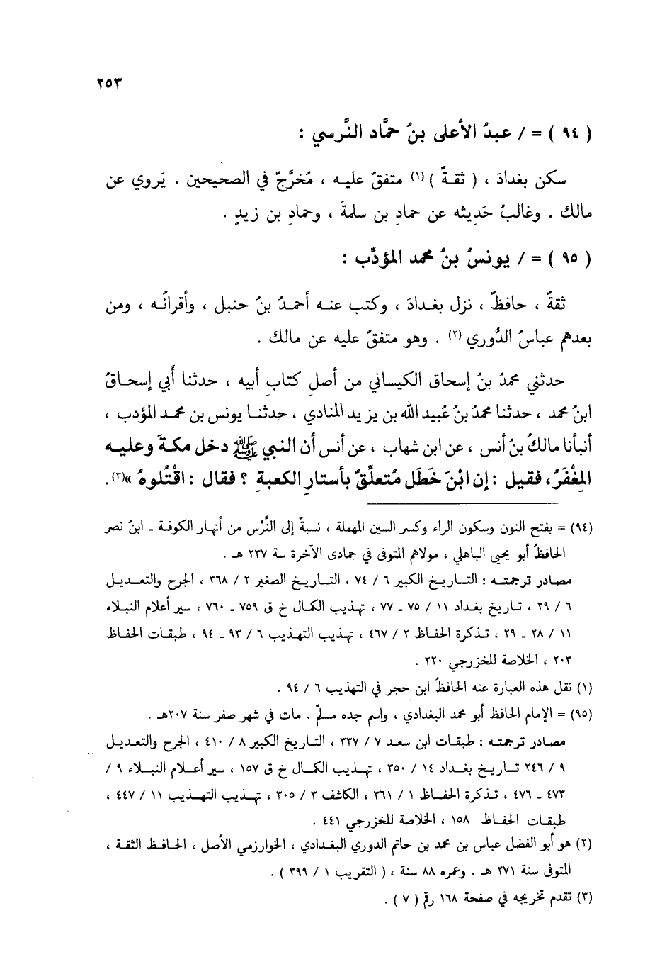 §عَبْدُ الْأَعْلَى بْنُ حَمَّادٍ النَّرْسِيُّ سَكَنَ بَغْدَادَ , ثِقَةٌ , مُتَّفَقٌ عَلَيْهِ , مُخَرَّجٌ فِي الصَّحِيحَيْنِ , يَرْوِي عَنْ مَالِكٍ , وَغَالِبُ حَدِيثِهِ عَنْ حَمَّادِ بْنِ سَلَمَةَ، وَحَمَّادِ بْنِ زَيْدٍ