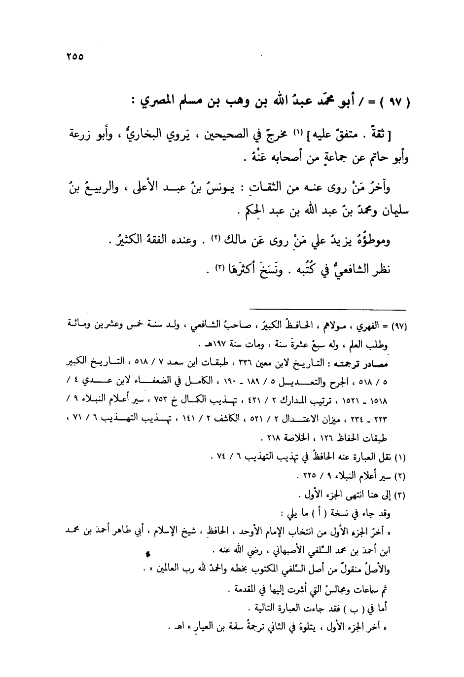 §أَبُو مُحَمَّدٍ عَبْدُ اللَّهِ بْنُ وَهْبِ بْنِ مُسْلِمٍ الْمِصْرِيُّ ثِقَةٌ , مُتَّفَقٌ عَلَيْهِ , مُخَرَّجٌ فِي الصَّحِيحَيْنِ , يَرْوِي الْبُخَارِيُّ , وَأَبُو زُرْعَةَ , وَأَبُو حَاتِمٍ، عَنْ جَمَاعَةٍ مِنْ أَصْحَابِهِ عَنْهُ. وَآخِرُ مَنْ رَوَى عَنْهُ مِنَ الثِّقَاتِ: يُونُسُ بْنُ عَبْدِ الْأَعْلَى , وَالرَّبِيعُ بْنُ سُلَيْمَانَ , وَمُحَمَّدُ بْنُ عَبْدِ اللَّهِ بْنِ عَبْدِ الْحَكَمِ , وَمُوَطَّؤُهُ يَزِيدُ عَلِي مَنْ رَوَى عَنْ مَالِكٍ , وَعِنْدَهُ الْفِقْهُ الْكَثِيرُ , نَظَرَ الشَّافِعِيُّ فِي كُتُبِهِ , وَنَسْخَ أَكْثَرَهَا