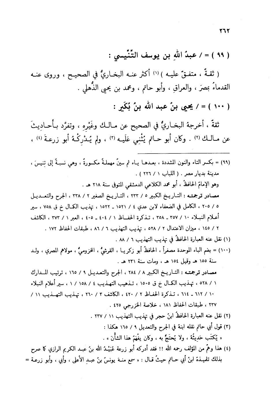 §يَحْيَى بْنُ عَبْدِ اللَّهِ بْنِ بُكَيْرٍ ثِقَةٌ , أَخْرَجَهُ الْبُخَارِيُّ فِي الصَّحِيحِ , عَنْ مَالِكٍ وَغَيْرِهِ وَتَفَرَّدَ بِأَحَادِيثَ عَنْ مَالِكٍ وَكَانَ أَبُو حَاتِمٍ يُثْنِي عَلَيْهِ , وَلَمْ يُدْرِكْهُ أَبُو زُرْعَةَ , -[263]- وَأَكْثَرَ عَنْهُ مُحَمَّدُ بْنُ إِسْحَاقَ الصَّغَانِيُّ , وَرَوَى الْمُوَطَّأَ عَنْ مَالِكٍ