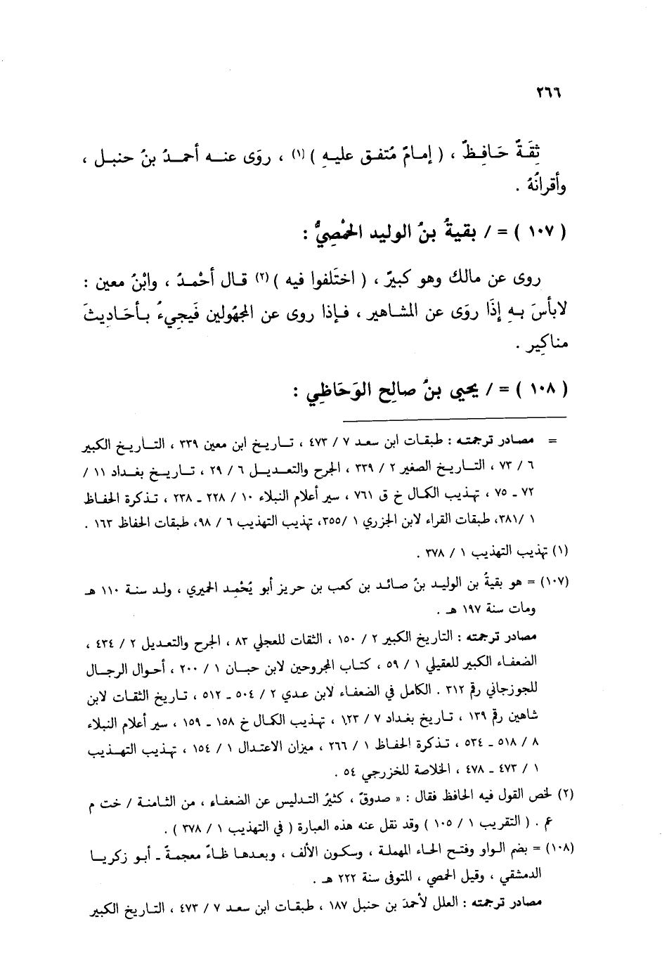§بَقِيَّةُ بْنُ الْوَلِيدِ الْحِمْصِيُّ رَوَى عَنْ مَالِكٍ وَهُوَ كَبِيرٌ , اخْتَلَفُوا فِيهِ , قَالَ أَحْمَدُ وَابْنُ مَعِينٍ: لَا بَأْسَ بِهِ إِذَا رَوَى عَنِ الْمَشَاهِيرِ , فَإِذَا رَوَى عَنِ الْمَجْهُولِينَ فَيَجِيءُ بِأَحَادِيثَ مَنَاكِيرَ