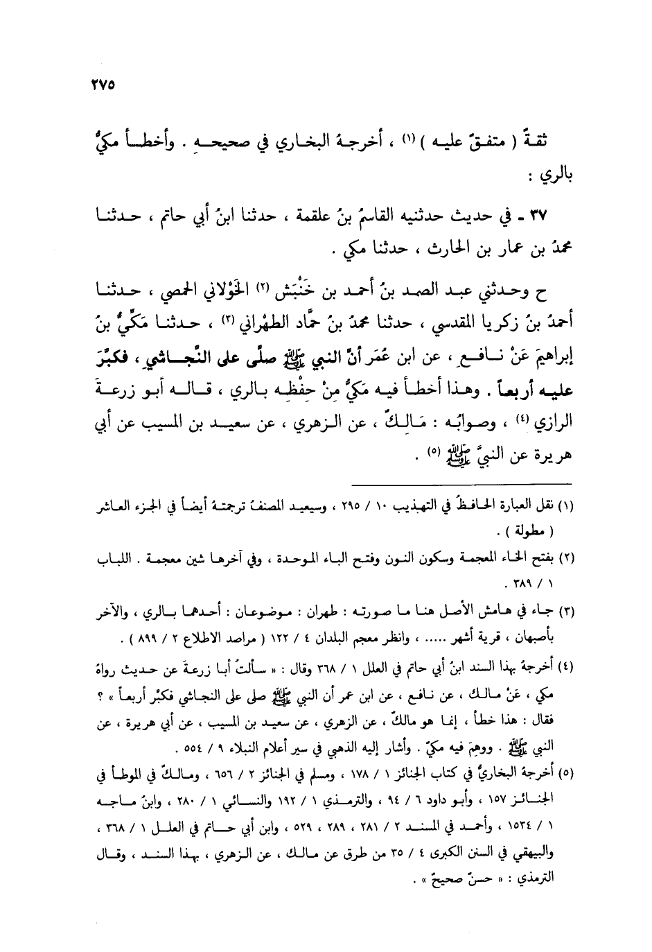 37 - فِي حَدِيثٍ حَدَّثَنِيهِ الْقَاسِمُ بْنُ عَلْقَمَةَ، حَدَّثَنَا ابْنُ أَبِي حَاتِمٍ، حَدَّثَنَا مُحَمَّدُ بْنُ عَمَّارِ بْنِ الْحَارِثِ، حَدَّثَنَا مَكِّيُّ، ح وَحَدَّثَنِي عَبْدُ الصَّمَدِ بْنُ أَحْمَدَ بْنِ خَنْبَشٍ الْخَوْلَانِيُّ الْحِمْصِيُّ، حَدَّثَنَا أَحْمَدُ بْنُ زَكَرِيَّا الْمَقْدِسِيُّ، حَدَّثَنَا مُحَمَّدُ بْنُ حَمَّادٍ الطِّهْرَانِيُّ، حَدَّثَنَا مَكِّيُّ بْنُ إِبْرَهِيمَ، عَنْ نَافِعٍ، عَنِ ابْنِ عُمَرَ، أَنَّ النَّبِيَّ صَلَّى اللهُ عَلَيْهِ وَسَلَّمَ §«صَلَّى عَلَى النَّجَاشِيِّ , فَكَبَّرَ عَلَيْهِ أَرْبَعًا» وَهَذَا أَخْطَأَ فِيهِ مَكِّيُّ مِنْ حِفْظِهِ بِالرِّيِّ , قَالَهُ أَبُو زُرْعَةَ الرَّازِيُّ , وَصَوَابُهُ: مَالِكٌ , عَنِ الزُّهْرِيِّ , عَنْ سَعِيدِ بْنِ الْمُسَيِّبِ , عَنْ أَبِي هُرَيْرَةَ , عَنِ النَّبِيِّ صَلَّى اللهُ عَلَيْهِ وَسَلَّمَ