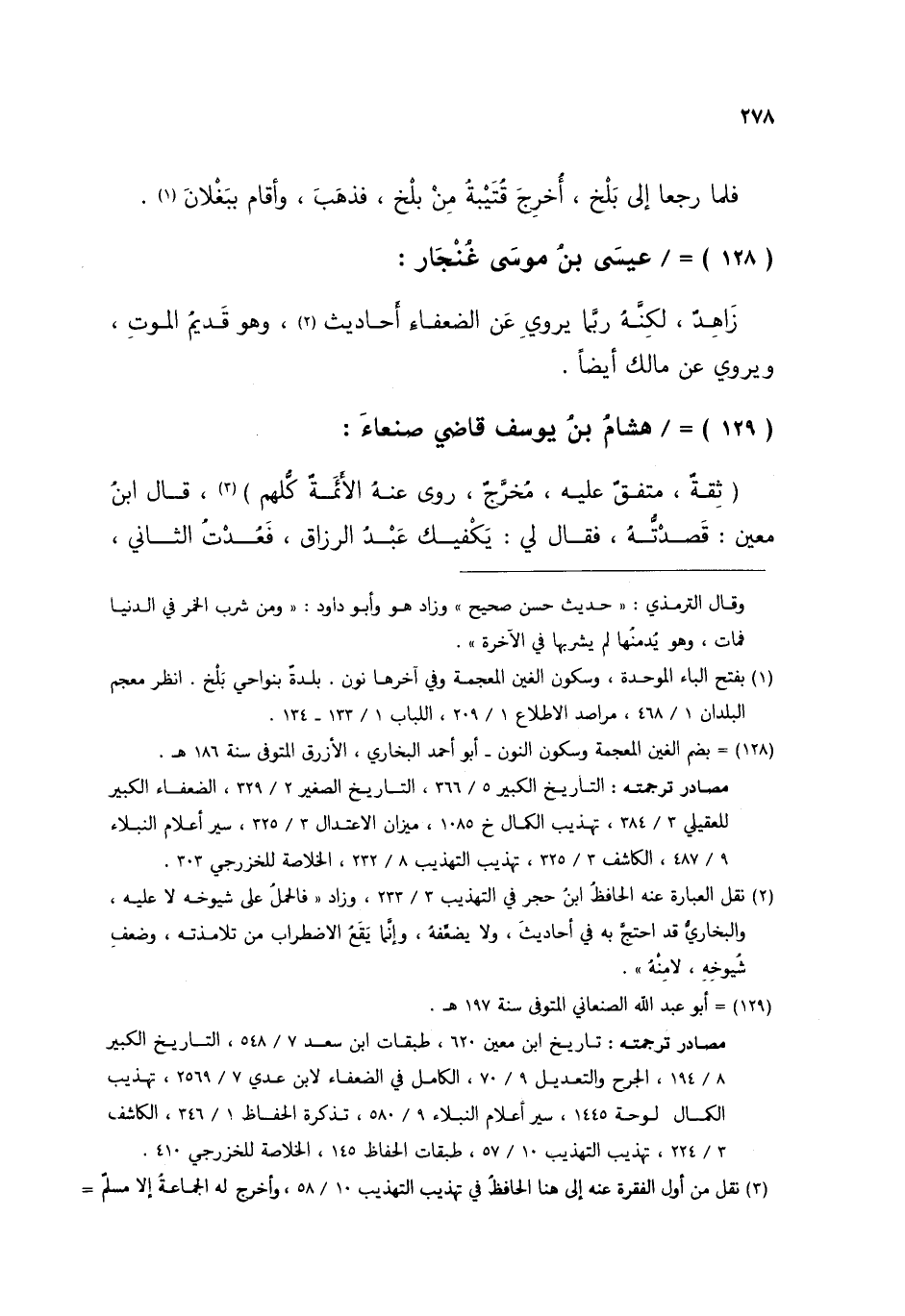 §هِشَامُ بْنُ يُوسُفَ قَاضِي صَنْعَاءَ ثِقَةٌ , مُتَّفَقٌ عَلَيْهِ , مُخَرَّجٌ , رَوَى عَنْهُ الْأَئِمَّةُ كُلُّهُمْ , قَالَ ابْنُ مَعِينٍ: قَصَدْتُهُ , فَقَالَ لِي: يَكْفِيكَ عَبْدُ الرَّزَّاقِ. فَعُدْتُ الثَّانِي -[279]- وَالثَّالِثَ. . . فَقَالَ أَوَتَعُودُ؟ فَقُلْتُ: وَاللَّهِ لَوِ احْتَجْتُ أَنْ أُقِيمَ دَهْرًا هَا هُنَا وَوَجَدْتُ إِلَى الْخَيْرِ سَبِيلًا مَا فَارَقْتُكَ. فَقَالَ: يَا بُنَيَّ , إِنَّمَا جَرَّبْتُكَ وَحِرْصَكَ عَلَى الْعِلْمِ , فَأَخْرَجَ إِلَيَّ كُتُبَهُ , وَأَمْلَى مِنْ حِفْظِهِ