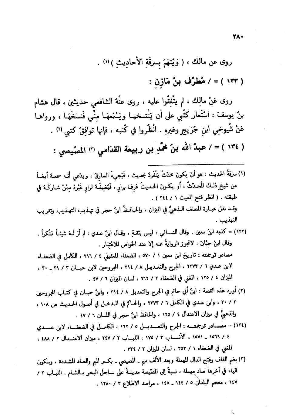 §مُطَرِّفُ بْنُ مَازِنٍ رَوَى عَنْ مَالِكٍ لَمْ يَتَّفِقُوا عَلَيْهِ , رَوَى عَنْهُ الشَّافِعِيُّ حَدِيثَيْنِ , قَالَ هِشَامُ بْنُ يُوسُفَ: اسْتَعَارَ كُتُبِي عَلَى أَنْ يَنْتَسِخَهَا وَيَسْمَعَهَا مِنِّي , فَنَسَخَهَا وَرَوَاهَا عَنْ شُيُوخِي ابْنِ جُرَيْجٍ وَغَيْرِهِ , انْظُرُوا فِي كُتُبِهِ , فَإِنَّهَا تُوَافِقُ كُتُبِي