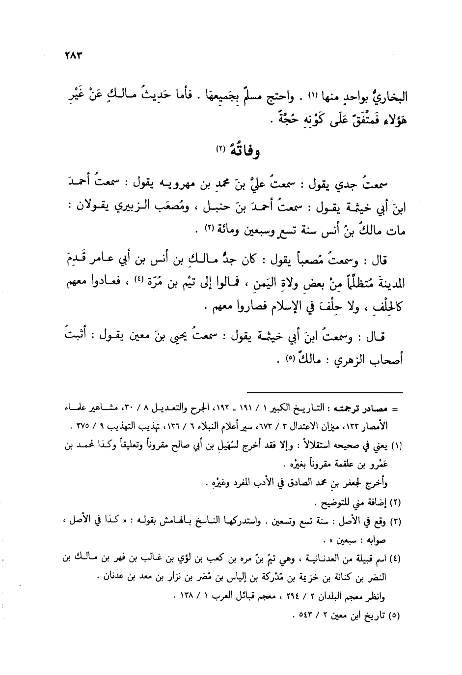 §وَفَاتَهُ سَمِعْتُ جَدِّيَ يَقُولُ: سَمِعْتُ عَلِيَّ بْنَ مُحَمَّدِ بْنِ مَهْرَوَيْهِ يَقُولُ: سَمِعْتُ أَحْمَدَ بْنَ أَبِي خَيْثَمَةَ يَقُولُ: سَمِعْتُ أَحْمَدَ بْنَ حَنْبَلٍ , وَمُصْعَبَ الزُّبَيْرِيَّ يَقُولَانِ: مَاتَ مَالِكُ بْنُ أَنَسٍ سَنَةَ تِسْعٍ وَسَبْعِينَ وَمِائَةٍ. قَالَ: وَسَمِعْتُ مُصْعَبًا يَقُولُ: كَانَ جَدُّ مَالِكِ بْنِ أَنَسِ بْنِ أَبِي عَامِرٍ قَدِمَ الْمَدِينَةَ مُتَظَلِّمًا مِنْ بَعْضِ ولَاةِ الْيَمَنِ , فَمَالُوا إِلَى تَيْمِ بْنِ مُرَّةَ , فَعَادُوا مَعَهُمْ كَالْحِلْفِ , وَلَا حِلْفَ فِي الْإِسْلَامِ , فَصَارُوا مَعَهُمْ. قَالَ: وَسَمِعْتُ ابْنَ أَبِي خَيْثَمَةَ يَقُولُ: سَمِعْتُ يَحْيَى بْنَ مَعِينٍ يَقُولُ: أَثْبَتُ أَصْحَابِ الزُّهْرِيِّ مَالِكٌ
