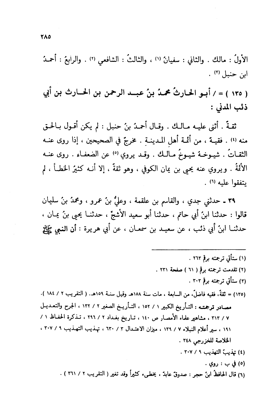 §أَبُو الْحَارِثِ مُحَمَّدُ بْنُ عَبْدِ الرَّحْمَنِ بْنِ الْحَارِثِ بْنِ أَبِي ذِئْبٍ الْمَدَنِيُّ ثِقَةٌ , أَثْنَى عَلَيْهِ مَالِكٌ , وَقَالَ أَحْمَدُ بْنُ حَنْبَلٍ: لَمْ يَكُنْ أَقْوَلَ بِالْحَقِّ مِنْهُ. فَقِيهٌ مِنْ أَئِمَّةِ أَهْلِ الْمَدِينَةِ , مُخَرَّجٌ فِي الصَّحِيحَيْنِ إِذَا رَوَى عَنْهُ الثِّقَاتُ , شُيُوخُهُ شُيُوخُ مَالِكٍ , وَقَدْ يَرْوِي عَنِ الضُّعَفَاءِ , رَوَى عَنْهُ الْأَئِمَّةُ , وَيَرْوِي عَنْهُ يَحْيَى بْنُ يَمَانٍ الْكُوفِيُّ , وَهُوَ ثِقَةٌ , إِلَّا أَنَّهُ كَثِيرُ الْخَطَأِ , لَمْ يَتَّفِقُوا عَلَيْهِ