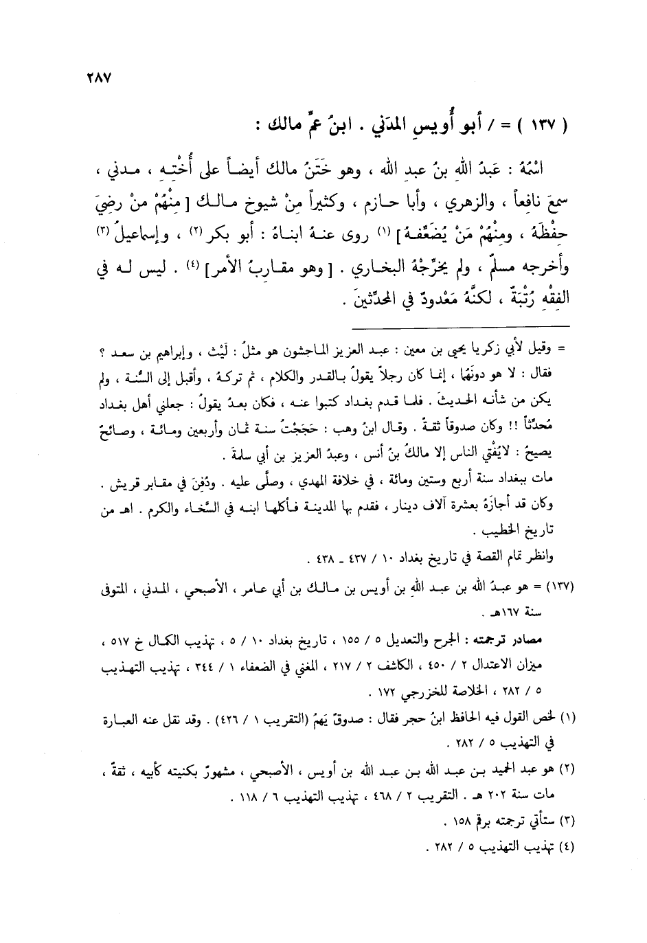 §أَبُو أُوَيْسٍ الْمَدَنِيُّ ابْنُ عَمِّ مَالِكٍ اسْمُهُ عَبْدُ اللَّهِ بْنُ عَبْدِ اللَّهِ , وَهُوَ خَتَنُ مَالِكٍ أَيْضًا عَلَى أُخْتِهِ , مَدَنِيُّ , سَمِعَ نَافِعًا , وَالزُّهْرِيَّ , وَأَبَا حَازِمٍ , وَكَثِيرًا مِنْ شُيُوخِ مَالِكٍ , مِنْهُمْ مَنْ رَضِيَ حِفْظَهُ , وَمِنْهُمْ مَنْ يُضَعِّفُهُ , رَوَى عَنْهُ ابْنَاهُ أَبُو بَكْرٍ وَإِسْمَاعِيلُ , وَأَخْرَجَهُ مُسْلِمٌ , وَلَمْ يُخْرِجْهُ الْبُخَارِيُّ , وَهُوَ مُقَارِبُ الْأَمْرِ , لَيْسَ لَهُ فِي الْفِقْهِ رُتْبَةٌ , لَكِنَّهُ مَعْدُودٌ فِي الْمُحَدِّثِينَ