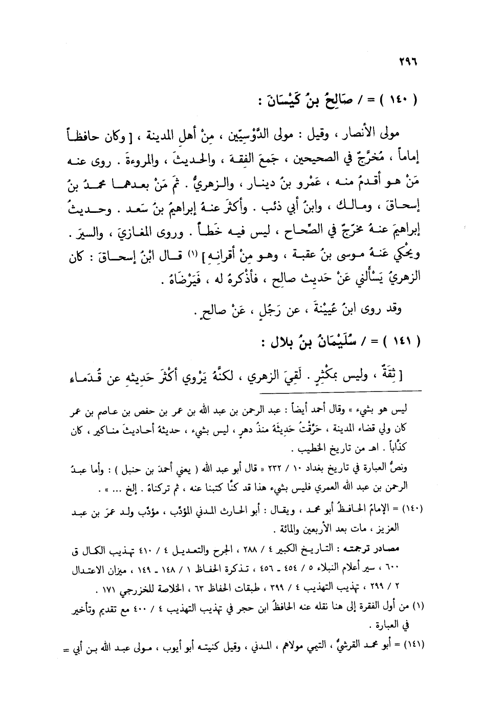§صَالِحُ بْنُ كَيْسَانَ مَوْلَى الْأَنْصَارِ , وَقِيلَ مَوْلَى الدَّوْسِيِّينَ , مِنْ أَهْلِ الْمَدِينَةِ , وَكَانَ حَافِظًا إِمَامًا , مُخَرَّجٌ فِي الصَّحِيحَيْنِ , جَمَعَ الْفِقْهَ وَالْحَدِيثَ وَالْمُرُوءَةَ رَوَى عَنْهُ مَنْ هُوَ أَقْدَمُ مِنْهُ: عَمْرُو بْنُ دِينَارٍ , وَالزُّهْرِيُّ , ثُمَّ مِنْ بَعْدِهِمَا مُحَمَّدُ بْنُ إِسْحَاقَ , وَمَالِكٌ , وَابْنُ أَبِي ذِئْبٍ , وَأَكْثَرَ عَنْهُ إِبْرَاهِيمُ بْنُ سَعْدٍ. وَحَدِيثُ إِبْرَاهِيمَ عَنْهُ مُخَرَّجٌ فِي الصِّحَاحِ , لَيْسَ فِيهِ خَطَأٌ , وَرَوَى الْمَغَازِيَ وَالسِّيَرَ , وَيَحْكِي عَنْهُ مُوسَى بْنُ عُقْبَةَ , وَهُوَ مِنْ أَقْرَانِهِ , قَالَ ابْنُ إِسْحَاقَ: كَانَ الزُّهْرِيُّ يَسْأَلُنِي عَنْ حَدِيثِ صَالِحٍ , فَأَذْكُرُهُ لَهُ , فَيَرْضَاهُ , وَقَدْ رَوَى ابْنُ عُيَيْنَةَ عَنْ رَجُلٍ عَنْ صَالِحٍ