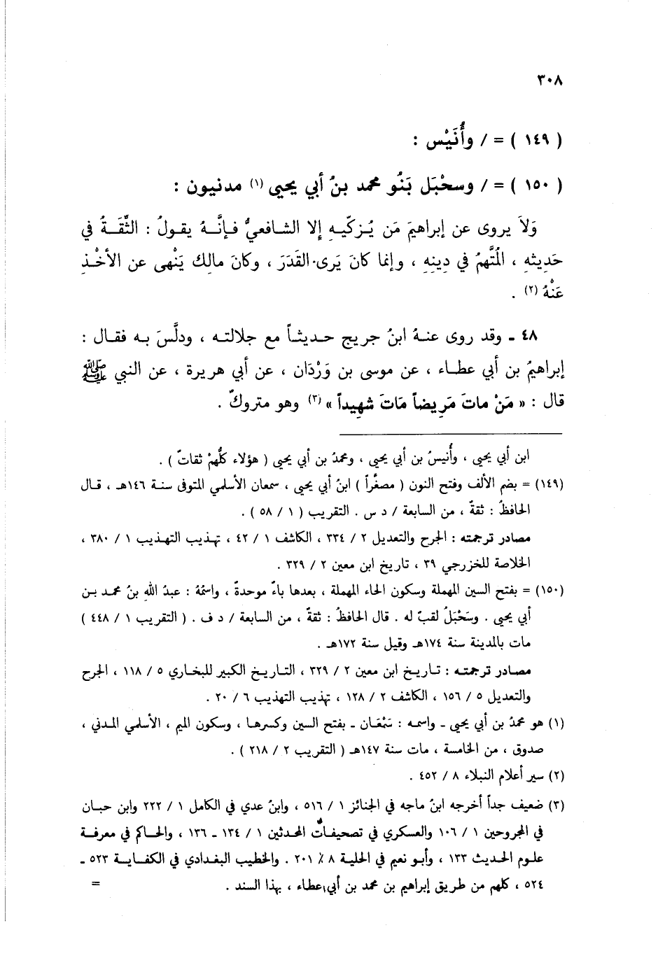 §وَسَحْبَلٌ بَنُو مُحَمَّدِ بْنِ أَبِي يَحْيَى، مَدَنِيُّونَ وَلَا يَرْوِي عَنْ إِبْرَاهِيمَ مَنْ يُزَكِّيهِ إِلَّا الشَّافِعِيُّ , فَإِنَّهُ يَقُولُ: الثِّقَةُ فِي حَدِيثِهِ , الْمُتَّهَمُ فِي دِينِهِ , وَإِنَّمَا كَانَ يَرَى الْقَدَرَ , وَكَانَ مَالِكٌ يَنْهَى عَنِ الْأَخْذِ عَنْهُ.
