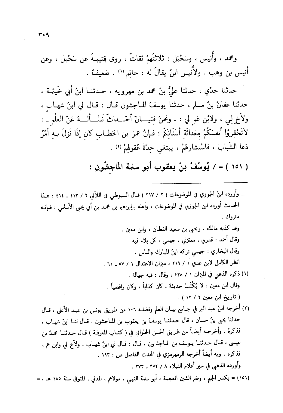 §يُوسُفُ بْنُ يَعْقُوبَ أَبُو سَلَمَةَ الْمَاجِشُونُ -[310]- ثِقَةٌ , سَمِعَ الزُّهْرِيَّ وَيَحْيَى بْنَ سَعِيدٍ وَغَيْرَهُمَا رَوَى عَنْهُ الْكِبَارُ وَعُمَرُ حَتَّى سَمِعَ مِنْهُ يَحْيَى بْنُ مَعِينٍ , وَعَلِيُّ بْنُ مُسْلِمٍ الطُّوسِيُّ , وَهُوَ وَأُخْوَتُهُ يُرَخِّصُونَ فِي السَّمَاعِ. قَالَ ابْنُ مَعِينٍ: كُنَّا نَأْتِي يُوسُفَ الْمَاجِشُونَ , فَيُحَدِّثُنَا فِي بَيْتٍ , وَجَوَارِيُّهُ فِي بَيْتٍ يَضْرِبْنَ بِالْمَعْزَفَةِ , وَهُوَ وَأُخْوَتُهُ وَابْنُ عَمِّهِ يُعْرَفُونَ بِذَلِكَ , وَهُمْ فِي الْحَدِيثِ ثِقَاتٌ مُخَرَّجونَ فِي الصِّحَاحِ