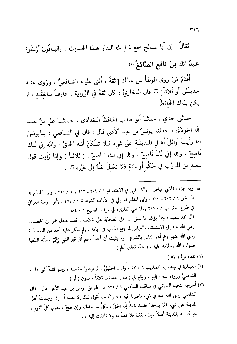 §عَبْدُ اللَّهِ بْنُ نَافِعٍ الصَّائِغُ أَقْدَمُ مَنْ رَوَى الْمُوَطَّأَ عَنْ مَالِكٍ ثِقَةٌ , أَثْنَى عَلَيْهِ الشَّافِعِيُّ , وَرَوَى عَنْهُ حَدِيثَيْنِ أَوْ ثَلَاثًا , قَالَ الْبُخَارِيُّ , كَانَ ثِقَةٌ فِي الرِّوَايَةِ , عَارِفًا بِالْفِقْهِ , لَمْ يَكُنْ بِذَاكَ الْحَافِظِ حَدَّثَنِي جَدِّي , حَدَّثَنَا أَبُو طَالِبٍ الْحَافِظُ الْبَغْدَادِيُّ , حَدَّثَنَا عَلِيُّ بْنُ عَبْدِ اللَّهِ الْخَوْلَانِيُّ , حَدَّثَنَا يُونُسُ بْنُ عَبْدِ الْأَعْلَى، قَالَ: قَالَ لِيَ الشَّافِعِيُّ: يَا يُونُسُ , إِذَا رَأَيْتَ أَوَائِلَ أَهْلِ الْمَدِينَةِ عَلَى شَيْءٍ فَلَا تَشُكَّنَّ أَنَّهُ الْحَقُّ , وَاللَّهِ إِنِّي لَكَ نَاصِحٌ , وَاللَّهِ إِنِّي لَكَ نَاصِحٌ , وَاللَّهِ إِنِّي لَكَ نَاصِحٌ - ثَلَاثًا - وَإِذَا رَأَيْتَ قَوْلَ سَعِيدِ بْنِ الْمُسَيِّبِ فِي حُكْمٍ أَوْ سُنَّةٍ فَلَا تَعْدِلْ عَنْهُ إِلَى غَيْرِهِ