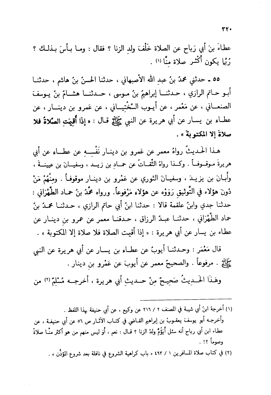 55 - حَدَّثَنِي مُحَمَّدُ بْنُ عَبْدِ اللَّهِ الْأَصْبَهَانِيُّ، حَدَّثَنَا الْحَسَنُ بْنُ هَاشِمٍ، حَدَّثَنَا أَبُو حَاتِمٍ الرَّازِيُّ، حَدَّثَنَا إِبْرَاهِيمُ بْنُ مُوسَى، حَدَّثَنَا هِشَامُ بْنُ يُوسُفَ الصَّنْعَانِيُّ، عَنْ مَعْمَرٍ، عَنْ أَيُّوبَ السِّخْتِيَانِيِّ، عَنْ عَمْرِو بْنِ دِينَارٍ، عَنْ عَطَاءِ بْنِ يَسَارٍ، عَنْ أَبِي هُرَيْرَةَ، عَنِ النَّبِيِّ صَلَّى اللهُ عَلَيْهِ وَسَلَّمَ قَالَ: §«إِذَا أُقِيمَتِ الصَّلَاةُ فَلَا صَلَاةَ إِلَّا الْمَكْتُوبَةَ» هَذَا الْحَدِيثُ رَوَاهُ مَعْمَرٌ , عَنْ عَمْرِو بْنِ دِينَارٍ نَفْسِهِ , عَنْ عَطَاءٍ , عَنْ أَبِي هُرَيْرَةَ مَوْقُوفًا , وَكَذَا رَوَاهُ الثِّقَاتُ , عَنْ حَمَّادِ بْنِ زَيْدٍ وَسُفْيَانَ بْنِ عُيَيْنَةَ , وَأَبَانَ بْنِ يَزِيدَ , وَسُفْيَانَ الثَّوْرِيِّ , عَنْ عَمْرِو بْنِ دِينَارٍ مَوْقُوفًا , وَمِنْهُمْ مَنْ دُونَ هَؤُلَاءِ فِي التَّوْثِيقِ , رَوَوْهُ عَنْ هَؤُلَاءِ مَرْفُوعًا وَرَوَاهُ مُحَمَّدُ بْنُ حَمَّادٍ الطِّهْرَانِيُّ , حَدَّثَنَا جَدِّي , وَابْنُ عَلْقَمَةَ قَالَا: حَدَّثَنَا ابْنُ أَبِي حَاتِمٍ الرَّازِيُّ , حَدَّثَنَا مُحَمَّدُ بْنُ حَمَّادٍ الطِّهْرَانِيُّ , حَدَّثَنَا عَبْدُ الرَّزَّاقِ , حَدَّثَنَا مَعْمَرٌ , عَنْ عَمْرِو بْنِ دِينَارٍ , عَنْ عَطَاءِ بْنِ يَسَارٍ , عَنْ أَبِي هُرَيْرَةَ: «إِذَا أُقِيمَتِ الصَّلَاةُ فَلَا صَلَاةَ إِلَّا الْمَكْتُوبَةَ» قَالَ مَعْمَرٌ: وَحَدَّثَنَا أَيُّوبُ , عَنْ عَطَاءِ بْنِ يَسَارٍ , عَنْ أَبِي هُرَيْرَةَ , عَنِ النَّبِيِّ صَلَّى اللهُ عَلَيْهِ وَسَلَّمَ مَرْفُوعًا , وَالصَّحِيحُ مَعْمَرٌ , عَنْ أَيُّوبَ , عَنْ عَمْرِو بْنِ دِينَارٍ. وَهَذَا الْحَدِيثُ صَحِيحٌ مِنْ حَدِيثِ أَبِي هُرَيْرَةَ أَخْرَجَهُ مُسْلِمٌ مِنْ -[321]- حَدِيثِ شُعْبَةَ , عَنْ وَرْقَاءَ , عَنْ عَمْرِو بْنِ دِينَارٍ مَرْفُوعًا , وَلَمْ يُخْرِجْهُ الْبُخَارِيُّ بِهَذَا السِّيَاقِ , وَإِنَّمَا أَخْرَجَهُ مِنْ حَدِيثِ مَالِكِ بْنِ بُحَيْنَةَ عَنِ النَّبِيِّ صَلَّى اللهُ عَلَيْهِ وَسَلَّمَ