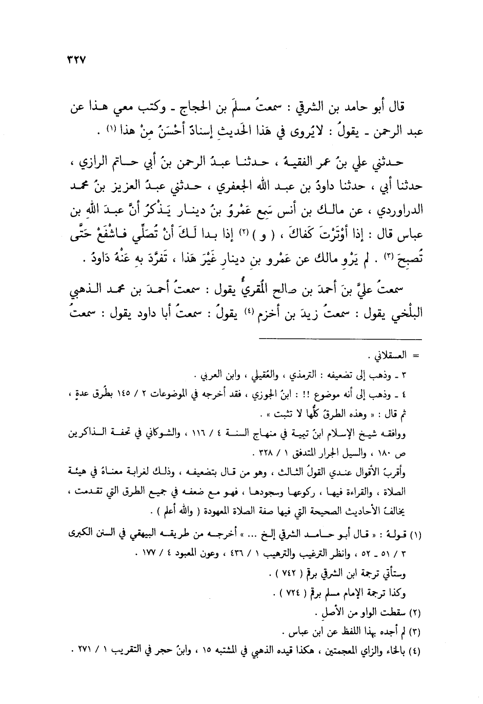 حَدَّثَنِي عَلِيُّ بْنُ عُمَرَ الْفَقِيهُ , حَدَّثَنَا عَبْدُ الرَّحْمَنِ بْنُ أَبِي حَاتِمٍ الرَّازِيُّ , حَدَّثَنَا أَبِي , حَدَّثَنَا دَاوُدُ بْنُ عَبْدِ اللَّهِ الْجَعْفَرِيُّ , حَدَّثَنِي عَبْدُ الْعَزِيزِ بْنُ مُحَمَّدٍ الدَّرَاوَرْدِيُّ , عَنْ مَالِكِ بْنِ أَنَسٍ , سَمِعَ عَمْرَو بْنَ دِينَارٍ، يَذْكُرُ أَنَّ عَبْدَ اللَّهِ بْنَ عَبَّاسٍ قَالَ: §«إِذَا أَوْتَرْتَ كَفَاكَ , وَإِذَا بَدَا لَكَ أَنْ تُصَلِّيَ فَاشْفَعْ , حَتَّى تُصْبِحَ» لَمْ يَرْوِ مَالِكٌ عَنْ عَمْرِو بْنِ دِينَارٍ غَيْرَ هَذَا , تَفَرَّدَ بِهِ عَنْهُ دَاوُدُ سَمِعْتُ عَلِيَّ بْنَ أَحْمَدَ بْنِ صَالِحٍ الْمُقْرِئُ، يَقُولُ: سَمِعْتُ أَحْمَدَ بْنَ مُحَمَّدٍ الذَّهَبِيَّ الْبَلْخِيَّ، يَقُولُ: سَمِعْتُ زَيْدَ بْنَ أَخْزَمَ، يَقُولُ: سَمِعْتُ أَبَا دَاوُدَ، يَقُولُ: سَمِعْتُ -[328]- شُعْبَةَ، يَقُولُ: اخْتَلَفْتُ إِلَى عَمْرِو بْنِ دِينَارٍ فِي مِائَةِ حَدِيثٍ خَمْسَمِائَةَ مَرَّةٍ