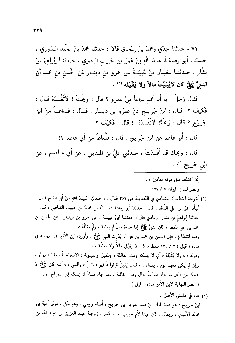 71 - حَدَّثَنَا جَدِّي، وَمُحَمَّدُ بْنُ إِسْحَاقَ قَالَا: حَدَّثَنَا مُحَمَّدُ بْنُ مَخْلَدٍ الدُّورِيِّ، حَدَّثَنَا أَبُو رِفَاعَةَ عَبْدُ اللَّهِ بْنُ عُمَرَ بْنِ حَبِيبٍ الْبَصْرِيُّ، حَدَّثَنَا إِبْرَاهِيمُ بْنُ بَشَّارٍ، حَدَّثَنَا سُفْيَانُ بْنُ عُيَيْنَةَ، عَنْ عَمْرِو بْنِ دِينَارٍ، عَنِ الْحَسَنِ بْنِ مُحَمَّدٍ، أَنَّ النَّبِيَّ صَلَّى اللهُ عَلَيْهِ وَسَلَّمَ «كَانَ §لَا يُبَيِّتُ مَالًا وَلَا يُقَيِّلُهُ» فَقَالَ رَجُلٌ: يَا أَبَا مُحَمَّدٍ , سَمَاعًا مِنْ عَمْرٍو؟ قَالَ: وَيْحَكَ لَا تُفْسِدْهُ. قَالَ فَكَيْفَ؟ قَالَ: ابْنُ جُرَيْجٍ عَنْ عَمْرِو بْنِ دِينَارٍ. قَالَ: فَسَمَاعًا مِنِ ابْنِ جُرَيْجٍ؟ قَالَ: وَيْحَكَ لَا تُفْسِدْهُ. قَالَ: فَكَيْفَ؟ قَالَ: أَبُو عَاصِمٍ عَنِ ابْنِ جُرَيْجِ. قَالَ: فَسَمَاعًا مِنْ أَبِي عَاصِمٍ؟ قَالَ: وَيْحَكَ قَدْ أَفْسَدْتَ , حَدَّثَنِي عَلِيُّ بْنُ الْمَدِينِيِّ , عَنْ أَبِي عَاصِمٍ , عَنِ ابْنِ جُرَيْجٍ -[341]- الْحَسَنُ هُوَ ابْنُ مُحَمَّدِ بْنِ عَلِيِّ بْنِ أَبِي طَالِبٍ