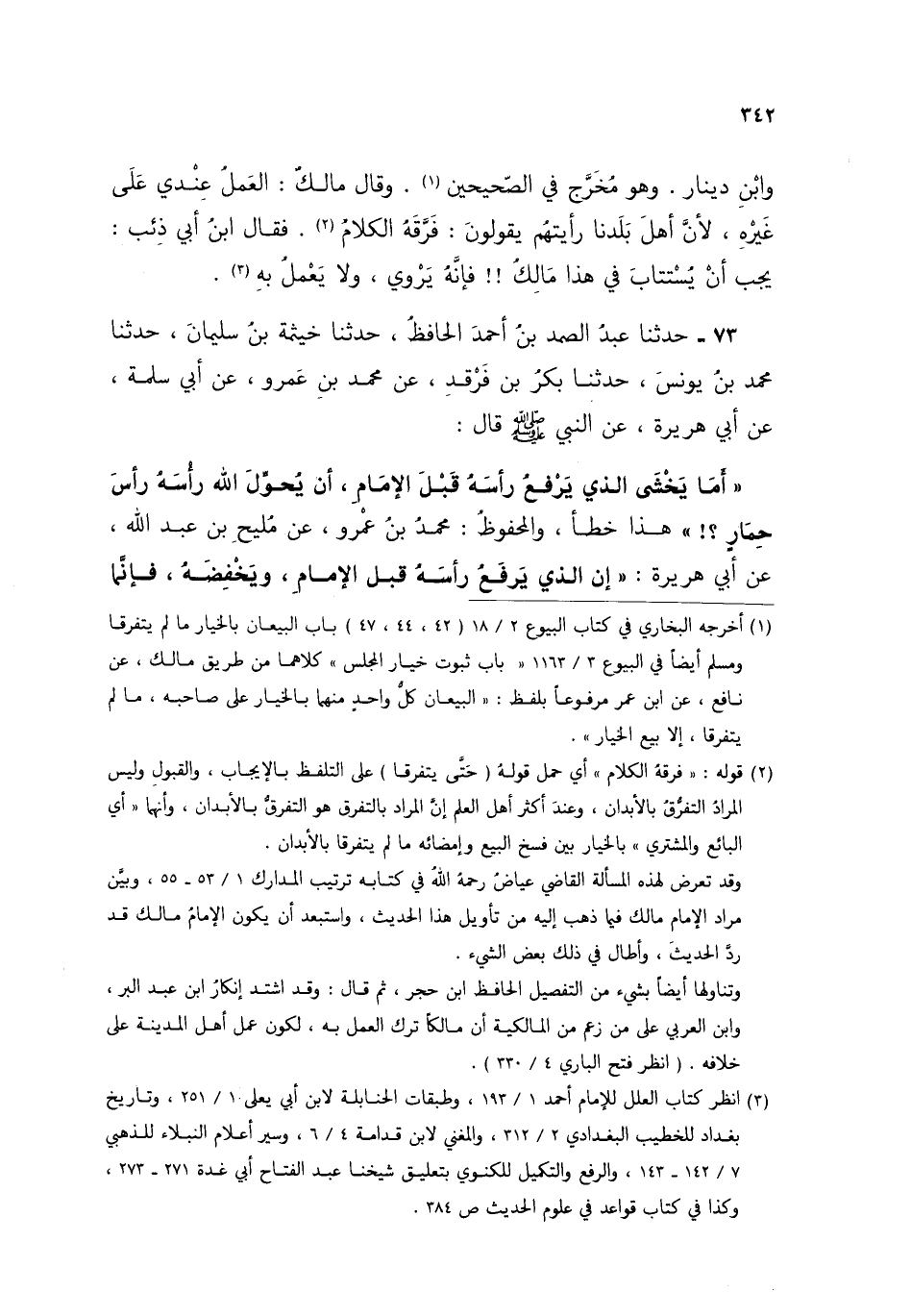 73 - حَدَّثَنَا عَبْدُ الصَّمَدِ بْنُ أَحْمَدَ الْحَافِظُ، حَدَّثَنَا خَيْثَمَةُ بْنُ سُلَيْمَانَ، حَدَّثَنَا مُحَمَّدُ بْنُ يُونُسَ، حَدَّثَنَا بَكْرُ بْنُ فَرْقَدٍ، عَنْ مُحَمَّدِ بْنِ عَمْرٍو، عَنْ أَبِي سَلَمَةَ، عَنْ أَبِي هُرَيْرَةَ، عَنِ النَّبِيِّ صَلَّى اللهُ عَلَيْهِ وَسَلَّمَ قَالَ: §«أَمَا يَخْشَى الَّذِي يَرْفَعُ رَأْسَهُ قَبْلَ الْإِمَامِ أَنْ يُحَوِّلَ اللَّهُ رَأْسَهُ رَأْسَ حِمَارٍ» هَذَا خَطَأٌ وَالْمَحْفُوظُ مُحَمَّدُ بْنُ عَمْرٍو , عَنْ مَلِيحِ بْنِ عَبْدِ اللَّهِ , عَنْ أَبِي هُرَيْرَةَ أَنَّ الَّذِيَ يَرْفَعُ رَأْسَهُ قَبْلَ الْإِمَامِ وَيَخْفِضُهُ , فَإِنَّمَا -[343]- نَاصِيَتُهُ بِيَدِ الشَّيْطَانِ. وَيَتَفَرَّدُ بِهِ مُحَمَّدٌ , عَنْ مَلِيحٍ , وَالْأَئِمَّةُ وَقَفُوهُ عَنْ مُحَمَّدٍ عَنْ مَلِيحٍ عَنْ أَبِي هُرَيْرَةَ , وَرُوِي عَنْ حَمَّادِ بْنِ زَيْدٍ , عَنْ مُحَمَّدٍ , عَنْ مَلِيحٍ مَوْقُوفًا , وَمَرْفُوعًا , وَالْوَقْفُ أَصَحُّ , وَالصَّحِيحُ مِنْ هَذَا الْحَدِيثِ حَدِيثُ مُحَمَّدِ بْنِ زِيَادٍ , عَنْ أَبِي هُرَيْرَةَ , عَنِ النَّبِيِّ صَلَّى اللهُ عَلَيْهِ وَسَلَّمَ رَوَاهُ عَنْهُ الْأَئِمَّةُ: شُعْبَةُ , وَحَمَّادُ بْنُ سَلَمَةَ , وَحَمَّادُ بْنُ زَيْدٍ , وَالْخَلْقُ , وَالنَّاسُ يَجْمَعُونَ مَنْ رَوَاهُ عَنِ ابْنِ زِيَادٍ , وَهُوَ مُخَرَّجٌ فِي الصَّحِيحَيْنِ , وَرُوِي عَنْ حَمَّادِ بْنِ سَلَمَةَ , عَنْ عَمَّارِ بْنِ أَبِي عَمَّارٍ , عَنْ أَبِي هُرَيْرَةَ , وَهُوَ مِنَ الْأَفْرَادِ