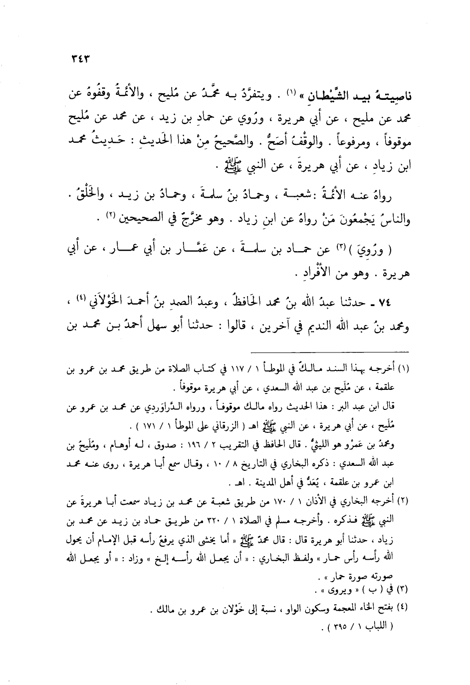 74 - حَدَّثَنَا مُحَمَّدُ بْنُ عَبْدِ اللَّهِ الْحَافِظُ، وَعَبْدُ الصَّمَدِ بْنُ أَحْمَدَ الْخَوْلَانِيُّ، وَمُحَمَّدُ بْنُ عَبْدِ اللَّهِ النَّدِيمِ، فِي آخَرِينَ , قَالُوا: حَدَّثَنَا أَبُو سَهْلٍ أَحْمَدُ بْنُ مُحَمَّدِ بْنِ -[344]- زِيَادٍ النَّحْوِيُّ بِبَغْدَادَ , حَدَّثَنَا الْحَسَنُ بْنُ مُكْرَمٍ، حَدَّثَنَا يَزِيدُ بْنُ هَارُونَ، عَنْ مُحَمَّدِ بْنِ عَمْرٍو، عَنْ أَبِي سَلَمَةَ، عَنْ أَبِي هُرَيْرَةَ، قَالَ: قَالَ رَسُولُ اللَّهِ صَلَّى اللهُ عَلَيْهِ وَسَلَّمَ: §«الْأَرْوَاحُ جُنُودٌ مُجَنَّدَةٌ , فَمَا تَعَارَفَ مِنْهَا ائْتَلَفَ وَمَا تَنَاكَرَ مِنْهَا اخْتَلَفَ» لَيْسَ هَذَا بِمَحْفُوظٍ مِنْ حَدِيثِ مُحَمَّدِ بْنِ عَمْرٍو , لَا يُعْلَمُ رَوَاهُ عَنُ يَزِيدَ غَيْرُ ابْنِ مُكْرَمٍ , وَهُوَ ثِقَةٌ , تَفَرَّدَ بِهِ عَنْهُ أَبُو سَهْلٍ , وَهُوَ ثِقَةٌ , وَرُبَّمَا دَخَلَ حَدِيثٌ فِي حَدِيثٍ , فَالْمَعْرُوفُ هَذَا مِنْ حَدِيثِ يَزِيدَ وَغَيْرِهِ , عَنْ حَمَّادِ بْنِ سَلَمَةَ , عَنْ سُهَيْلٍ , عَنْ أَبِيهِ , عَنْ أَبِي هُرَيْرَةَ عَنِ النَّبِيِّ صَلَّى اللهُ عَلَيْهِ وَسَلَّمَ , وَلَهُ طُرُقٌ تُجْمَعُ