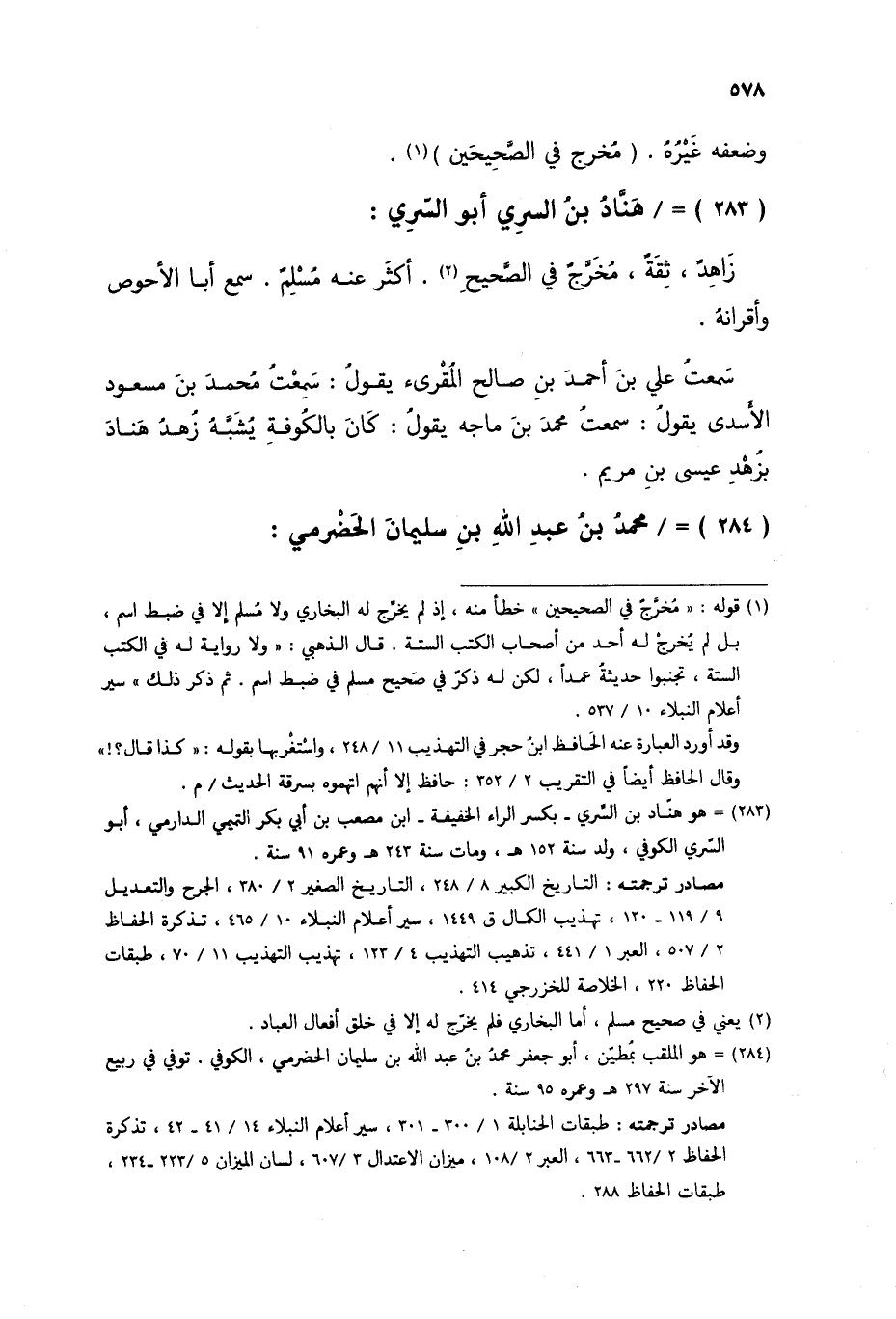 §هَنَّادُ بْنُ السَّرِيِّ أَبُو السَّرِيِّ زَاهِدٌ ثِقَةٌ مُخَرَّجٌ فِي الصَّحِيحِ أَكْثَرَ عَنْهُ مُسْلِمٌ سَمِعَ أَبَا الْأَحْوَصِ وَأَقْرَانَهُ سَمِعْتُ عَلِيَّ بْنَ أَحْمَدَ بْنِ صَالِحٍ الْمُقْرِئَ يَقُولُ: سَمِعْتُ مُحَمَّدَ بْنَ مَسْعُودٍ الْأَسَدِيَّ يَقُولُ: سَمِعْتُ مُحَمَّدَ بْنَ مَاجَهْ يَقُولُ: كَانَ بِالْكُوفَةِ يُشَبَّهُ زُهْدُ هَنَّادٍ بِزُهْدِ عِيسَى ابْنِ مَرْيَمَ