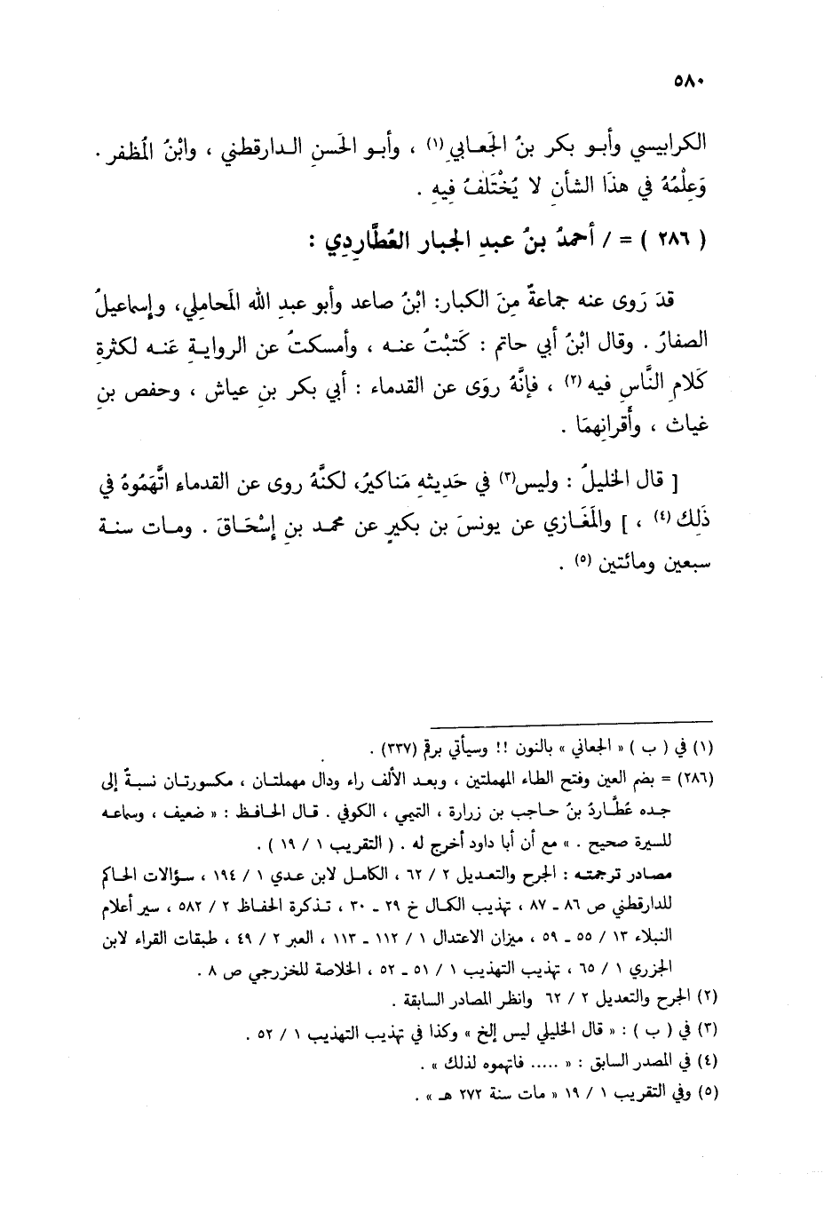 §أَحْمَدُ بْنُ عَبْدِ الْجَبَّارِ الْعُطَارِدِيُّ قَدْ رَوَى عَنْهُ جَمَاعَةٌ مِنَ الْكِبَارِ ابْنُ صَاعِدٍ، وَأَبُو عَبْدِ اللَّهِ الْمَحَامِلِيُّ، وَإِسْمَاعِيلُ الصَّفَّارُ، وَقَالَ ابْنُ أَبِي حَاتِمٍ: كَتَبْتُ عَنْهُ، وَأَمْسَكْتُ عَنِ الرِّوَايَةِ عَنْهُ لِكَثْرَةِ كَلَامِ النَّاسِ فِيهِ، فَإِنَّهُ رَوَى عَنِ الْقُدَمَاءِ أَبِي بَكْرِ بْنِ عَيَّاشٍ، وَحَفْصِ بْنِ غِيَاثٍ، وَأَقْرَانِهِمَا. قَالَ الْخَلِيلُ: وَلَيْسَ فِي حَدِيثِهِ مَنَاكِيرُ، لَكِنَّهُ رَوَى عَنِ الْقُدَمَاءِ اتَّهَمُوهُ فِي ذَلِكَ، وَالْمَغَازَيَ عَنْ يُونُسَ بْنِ بُكَيْرٍ، عَنْ مُحَمَّدِ بْنِ إِسْحَاقَ، وَمَاتَ سَنَةَ سَبْعِينَ وَمِائَتَيْنِ