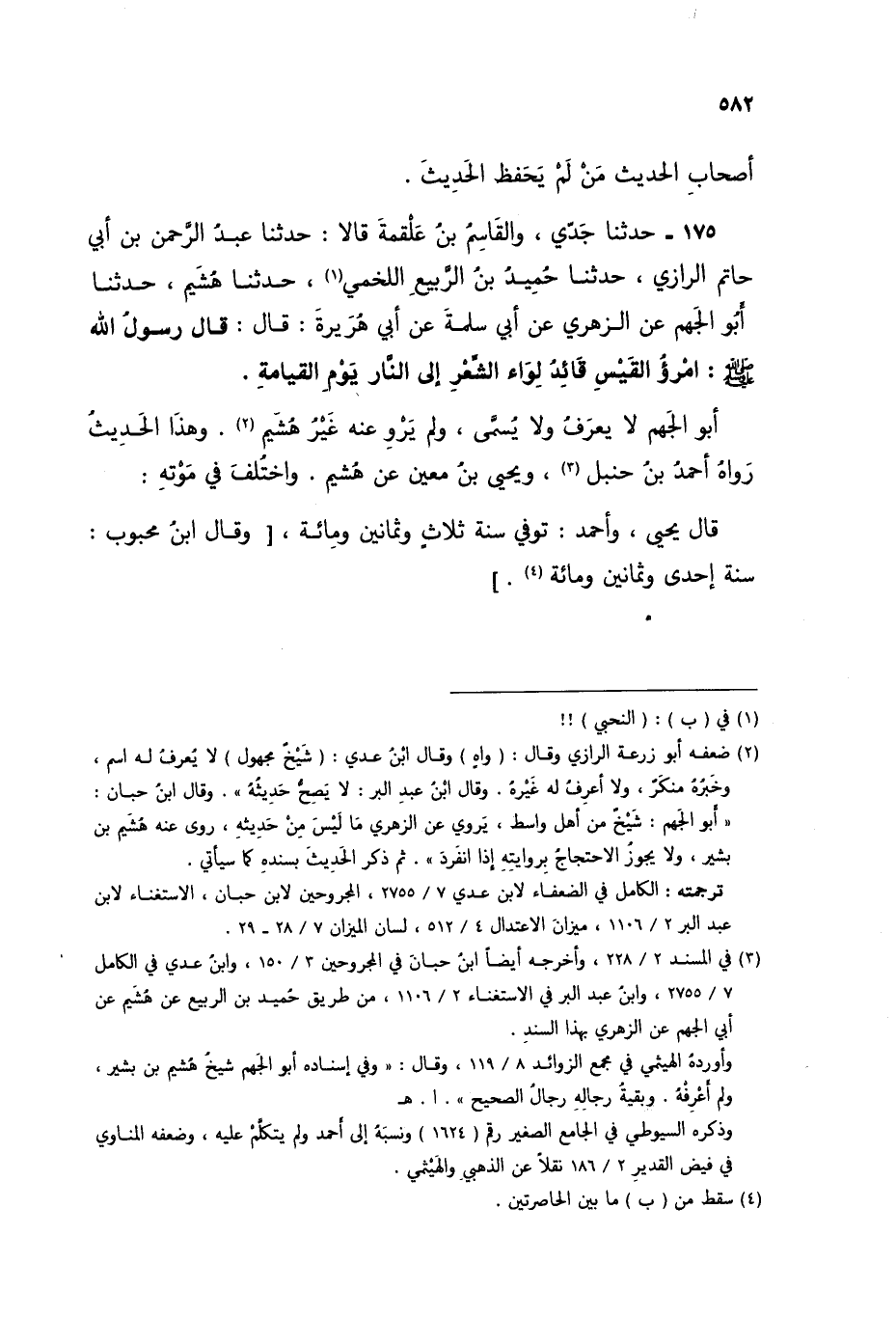 175 - حَدَّثَنَا جَدِّي، وَالْقَاسِمُ بْنُ عَلْقَمَةَ، قَالَا: حَدَّثَنَا عَبْدُ الرَّحْمَنِ بْنُ أَبِي حَاتِمٍ الرَّازِيُّ، حَدَّثَنَا حُمَيْدُ بْنُ الرَّبِيعِ اللَّخْمِيُّ، حَدَّثَنَا هُشَيْمٌ، حَدَّثَنَا أَبُو الْجَهْمِ، عَنِ الزُّهْرِيِّ، عَنْ أَبِي سَلَمَةَ، عَنْ أَبِي هُرَيْرَةَ، قَالَ: قَالَ رَسُولُ اللَّهِ صَلَّى اللهُ عَلَيْهِ وَسَلَّمَ: §«امْرُؤُ الْقَيْسِ قَائِدُ لِوَاءِ الشِّعْرِ إِلَى النَّارِ يَوْمَ الْقِيَامَةِ» أَبُو الْجَهْمِ لَا يُعْرَفُ، وَلَا يُسَمَّى، وَلَمْ يَرْوِ عَنْهُ غَيْرُ هُشَيْمٍ، وَهَذَا الْحَدِيثُ رَوَاهُ أَحْمَدُ بْنُ حَنْبَلٍ، وَيَحْيَى بْنُ مَعِينٍ، عَنْ هُشَيْمٍ، وَاخْتُلِفَ فِي مَوْتِهِ قَالَ يَحْيَى، وَأَحْمَدُ: تُوُفِّيَ سَنَةَ ثَلَاثٍ وَثَمَانِينَ وَمِائَةٍ وَقَالَ ابْنُ مَحْبُوبٍ، سَنَةَ إِحْدَى وَثَمَانِينَ وَمِائَةٍ