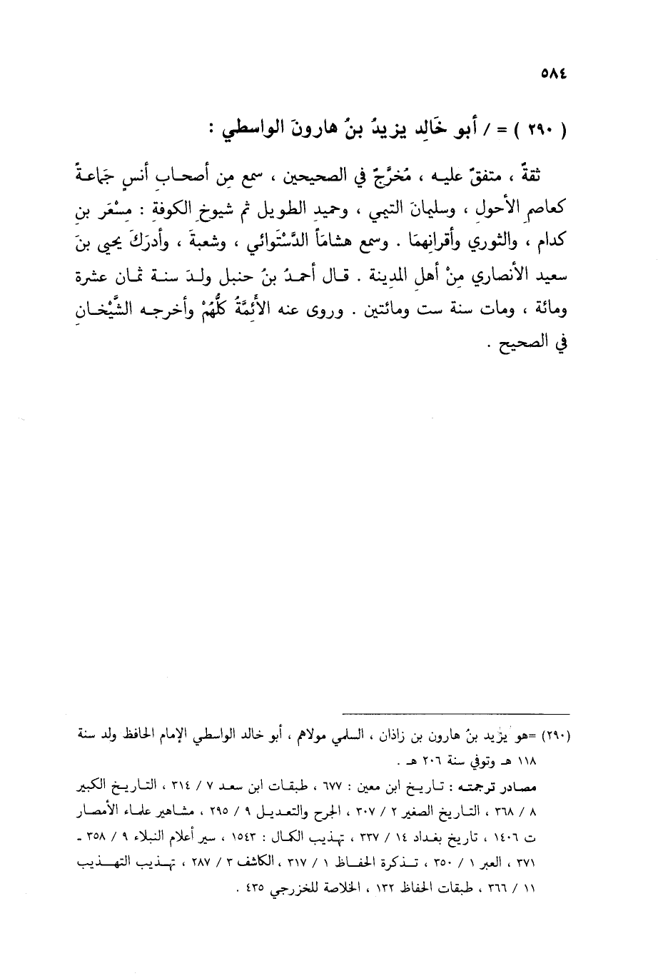 §أَبُو خَالِدٍ يَزِيدُ بْنُ هَارُونَ الْوَاسِطِيُّ ثِقَةٌ مُتَّفَقٌ عَلَيْهِ مُخَرَّجُ فِي الصَّحِيحَيْنِ سَمِعَ مِنَ أَصْحَابِ أَنَسٍ جَمَاعَةً كَعَاصِمٍ الْأَحْوَلِ، وَسُلَيْمَانَ التَّيْمِيِّ، وَحُمَيْدٍ الطَّوِيلِ، ثُمَّ شُيُوخِ الْكُوفَةِ مِسْعَرِ بْنِ كِدَامٍ، وَالثَّوْرِيِّ، وَأَقْرَانِهِمَا وَسَمِعَ هِشَامًا الدَّسْتُوَائِيَّ، وَشُعْبَةَ، وَأَدْرَكَ يَحْيَى بْنَ سَعِيدٍ الْأَنْصَارِيَّ، مِنْ أَهْلِ الْمَدِينَةِ قَالَ أَحْمَدُ بْنُ حَنْبَلٍ: وُلِدَ سَنَةَ ثَمَانَ عَشْرَةَ وَمِائَةٍ وَمَاتَ سَنَةَ سِتٍّ وَمِائَتَيْنِ وَرَوَى عَنْهُ الْأَئِمَّةُ كُلُّهُمْ وَأَخْرَجَهُ الشَّيْخَانِ فِي الصَّحِيحِ