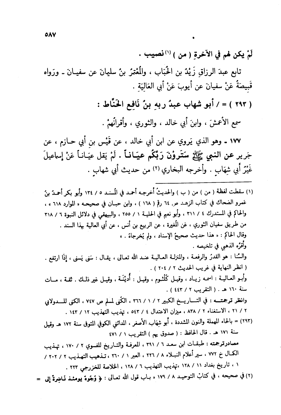 177 - وَهُوَ الَّذِي يَرْوِي عَنِ ابْنِ أَبِي خَالِدٍ، عَنْ قَيْسِ بْنِ أَبِي حَازِمٍ، عَنْ جَرِيرٍ، عَنِ النَّبِيِّ صَلَّى اللهُ عَلَيْهِ وَسَلَّمَ «سَتَرَوْنَ رَبَّكُمْ عِيَانًا» لَمْ يَقُلْ عِيَانًا، عَنْ إِسْمَاعِيلَ، غَيْرُ أَبِي شِهَابٍ، وَأَخْرَجَهُ الْبُخَارِيُّ، مِنْ حَدِيثِ أَبِي شِهَابٍ -[588]- قَالَ ابْنُ أَبِي خَيْثَمَةَ: سَمِعْتُ يَحْيَى بْنَ مَعِينٍ، يَقُولُ: أَبُو شِهَابٍ الْحَنَّاطُ ثِقَةٌ وَهُوَ مِنْ أَهْلِ الْكُوفَةِ نَزَلَ الْمَدَائِنَ