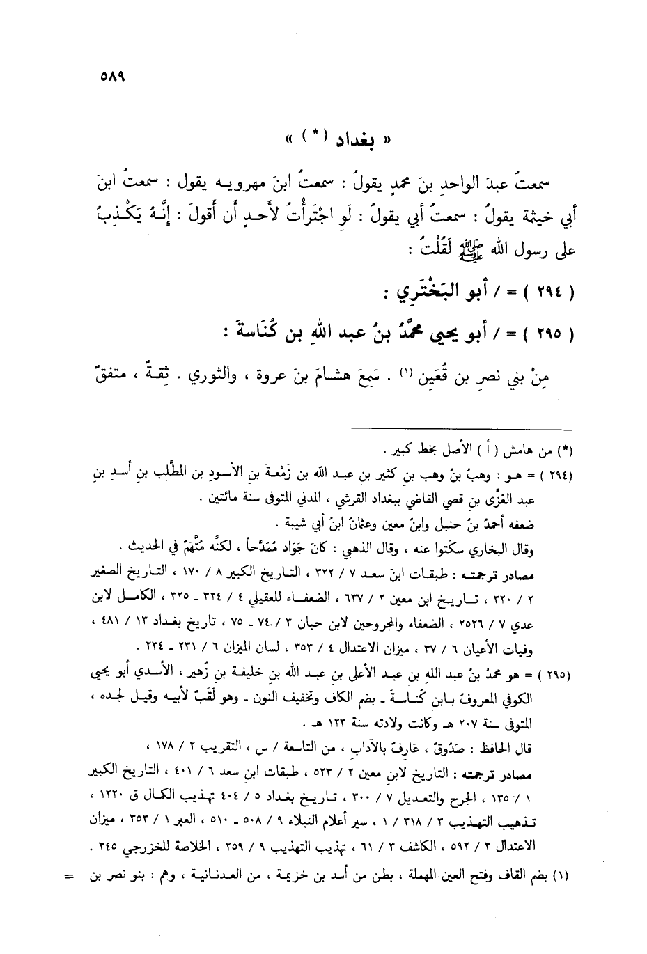 §أَبُو يَحْيَى مُحَمَّدُ بْنُ عَبْدِ اللَّهِ بْنِ كُنَاسَةَ مِنْ بَنِي نَصْرِ بْنِ قُعَيْنِ سَمِعَ هِشَامَ بْنَ عُرْوَةَ، وَالثَّوْرِيَّ، ثِقَةٌ، مُتَّفَقٌ -[590]- عَلَيْهِ، سَمِعَ مِنْهُ أَحْمَدُ، وَيَحْيَى، وَابْنُ الْمَدِينِيِّ، وَمَنْ بَعْدَهُمْ، وَآخِرُ مَنْ رَوَى عَنْهُ بِبَغْدَادَ مُحَمَّدُ بْنُ الْفَرَجِ الْأَزْرَقُ، وَالْحَارِثُ بْنُ أَبِي أُسَامَةَ