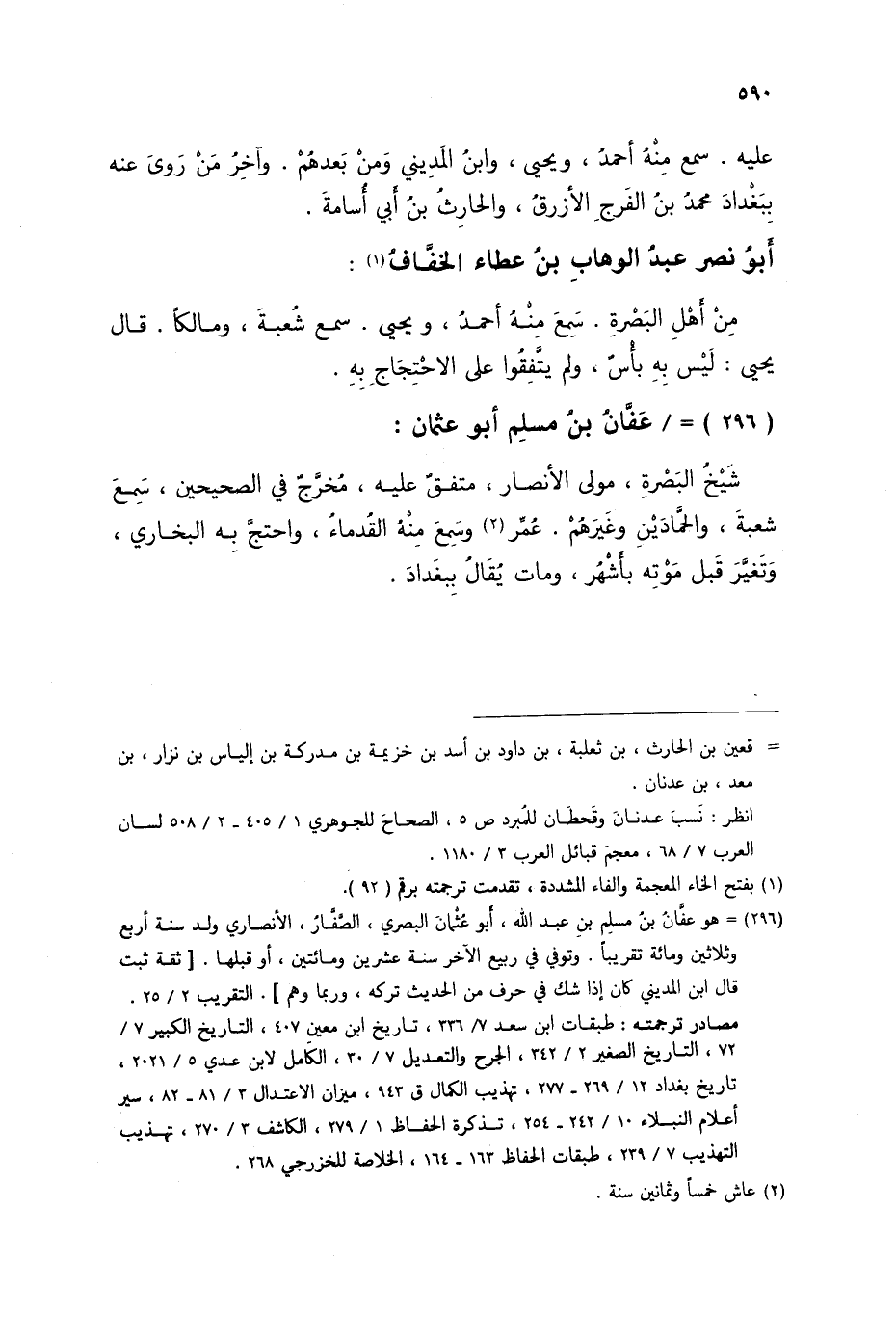 §عَفَّانُ بْنُ مُسْلِمٍ أَبُو عُثْمَانَ شَيْخُ الْبَصْرَةِ، مَوْلَى الْأَنْصَارِ، مُتَّفَقٌ عَلَيْهِ مُخَرَّجُ فِي الصَّحِيحَيْنِ، سَمِعَ شُعْبَةَ، وَالْحَمَّادَيْنِ، وَغَيْرَهُمْ عُمِّرَ، وَسَمِعَ مِنْهُ الْقُدَمَاءُ، وَاحْتَجَّ بِهِ الْبُخَارِيُّ، وَتَغَيَّرَ قَبْلَ مَوْتِهِ بِأَشْهُرٍ، وَمَاتَ يُقَالُ بِبَغْدَادَ