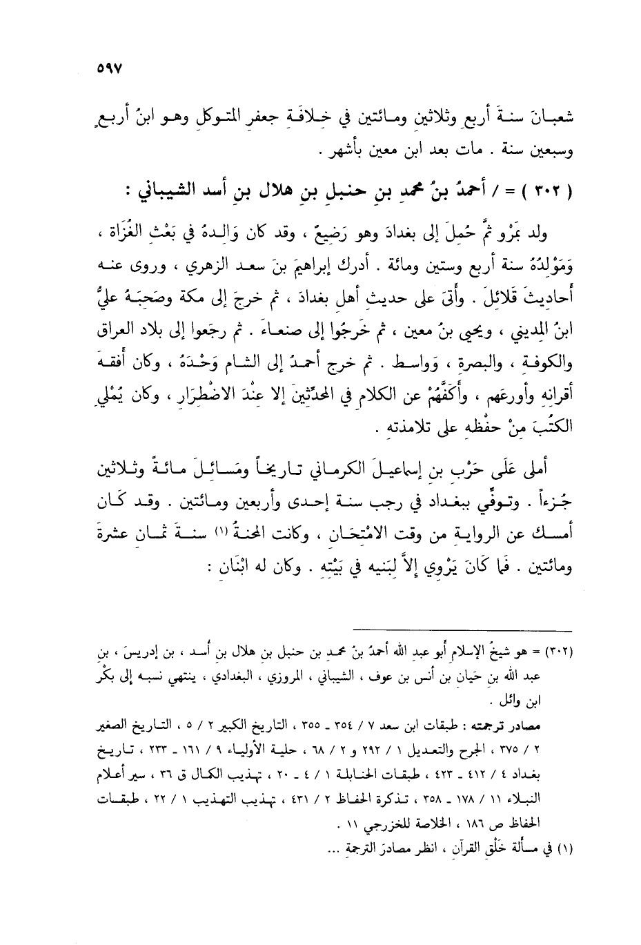 §أَحْمَدُ بْنُ مُحَمَّدِ بْنِ حَنْبَلِ بْنِ هِلَالِ بْنِ أَسَدٍ الشَّيْبَانِيُّ وُلِدَ بِمَرْو، ثُمَّ حُمِلَ إِلَى بَغْدَادَ وَهُوَ رَضِيعٌ، وَقَدْ كَانَ وَالِدُهُ فِي بَعْثِ الْغُزَاةِ، وَمَوْلِدُهُ سَنَةَ أَرْبَعٍ وَسِتِّينَ وَمِائَةٍ أَدْرَكَ إِبْرَاهِيمَ بْنَ سَعْدٍ الزُّهْرِيَّ، وَرَوَى عَنْهُ أَحَادِيثَ قَلَائِلَ، وَأَتَى عَلَى حَدِيثِ أَهْلِ بَغْدَادَ ثُمَّ خَرَجَ إِلَى مَكَّةَ، وَصَحِبَهُ عَلِيُّ بْنُ الْمَدِينِيِّ، وَيَحْيَى بْنُ مَعِينٍ، ثُمَّ خَرَجُوا إِلَى صَنْعَاءَ، ثُمَّ رَجَعُوا إِلَى بِلَادِ الْعِرَاقِ، وَالْكُوفَةِ، وَالْبَصْرَةِ، وَوَاسِطٍ، ثُمَّ خَرَجَ أَحْمَدُ إِلَى الشَّامِ وَحْدَهُ، وَكَانَ أَفْقَهَ أَقْرَانِهِ، وَأَوْرَعَهُمْ وَأَكَفَّهُمْ عَنِ الْكَلَامِ فِي الْمُحَدِّثِينَ إِلَّا عِنْدَ الِاضْطِرَارِ، وَكَانَ يُمْلِي الْكُتُبَ مِنْ حِفْظِهِ عَلَى تَلَامِذَتِهِ أَمْلَى عَلَى حَرْبِ بْنِ إِسْمَاعِيلَ الْكَرْمَانِيِّ تَارِيخًا وَمَسَائِلَ مِائَةً وَثَلَاثِينَ جُزْءًا، وَتُوُفِّيَ بِبَغْدَادَ فِي رَجَبٍ سَنَةَ إِحْدَى وَأَرْبَعِينَ وَمِائَتَيْنِ، وَقَدْ كَانَ أَمْسَكَ عَنِ الرِّوَايَةِ مِنْ وَقْتِ الِامْتِحَانِ وَكَانَتِ الْمِحْنَةُ سَنَةَ ثَمَانِ عَشْرَةَ وَمِائَتَيْنِ فَمَا كَانَ يَرْوِي إِلَّا لِبَنِيهِ فِي بَيْتِهِ وَكَانَ لَهُ ابْنَانِ
