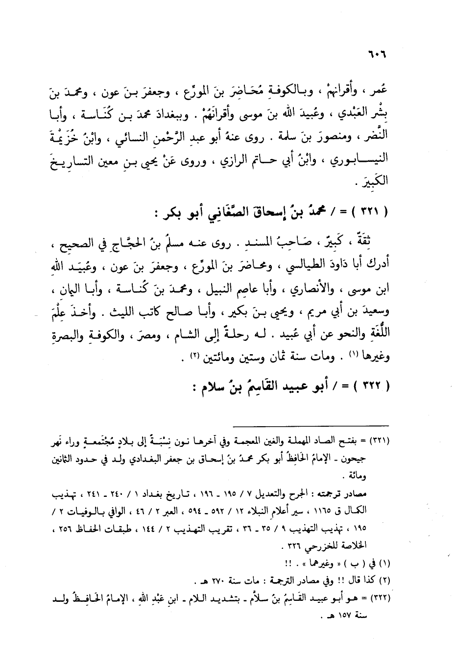§أَبُو عُبَيْدٍ الْقَاسِمُ بْنُ سَلَّامٍ -[607]- كَبِيرٌ يُقَارَنُ بِأَحْمَدَ بْنِ حَنْبَلٍ فِي الْعِلْمِ غَيْرَ أَنَّهُ يَخْتَارُ فِي الْفِقْهِ وَيَمِيلُ إِلَى الْكُوفِيِّينَ فِي أَكْثَرِهِ وَكَانَ سَاكِنَ بَغْدَادَ مَاتَ بِمَكَّةَ سَنَةَ سَبْعَ عَشْرَةَ وَمِائَتَيْنِ