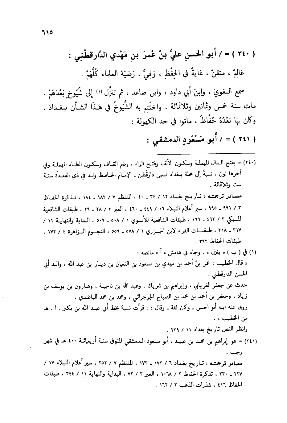 §أَبُو الْحَسَنِ عَلِيُّ بْنُ عُمَرَ بْنِ مَهْدِيٍّ الدَّارَقُطْنِيُّ عَالِمٌ مُتْقِنٌ غَايَةً فِي الْحِفْظِ وَفِيٌّ رَضِيَهُ الْعُلَمَاءُ كُلُّهُمْ سَمِعَ الْبَغَوِيَّ وَابْنَ أَبِي دَاوُدَ وَابْنَ صَاعِدٍ ثُمَّ تَنَزَّلَ إِلَى شُيُوخٍ بَعْدَهُمْ مَاتَ سَنَةَ خَمْسٍ وَثَمَانِينَ وَثَلَاثِمِائَةٍ وَاخْتَتَمَ بِهِ الشُّيُوخُ فِي هَذَا الشَّأْنِ بِبَغْدَادَ وَكَانَ بِهَا بَعْدَهُ حُفَّاظٌ مَاتُوا فِي حَدِّ الْكُهُولَةِ