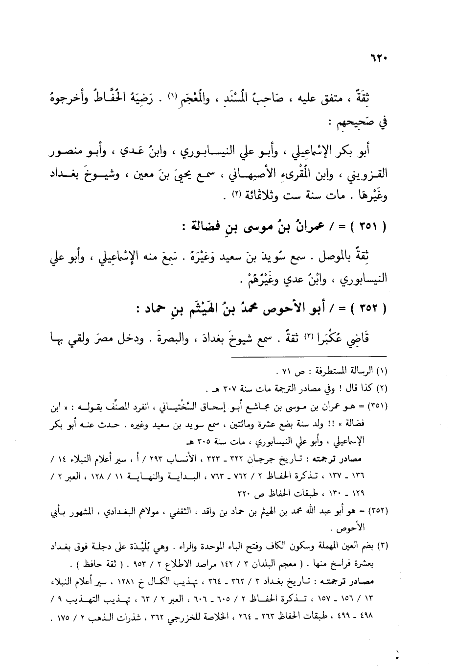 §عِمْرَانُ بْنُ مُوسَى بْنِ فَضَالَةَ ثِقَةٌ بِالْمَوْصِلِ سَمِعَ سُوَيْدَ بْنَ سَعِيدٍ وَغَيْرَهُ سَمِعَ مِنْهُ الْإِسْمَاعِيلِيُّ وَأَبُو عَلِيٍّ النَّيْسَابُورِيُّ وَابْنُ عَدِيٍّ وَغَيْرُهُمْ