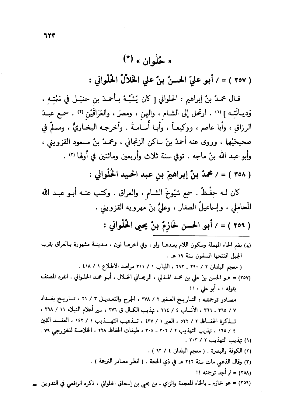 §أَبُو عَلِيٍّ الْحَسَنُ بْنُ عَلِيٍّ الْخَلَّالُ الْحُلْوَانِيُّ قَالَ مُحَمَّدُ بْنُ إِبْرَاهِيمَ الْحُلْوَانِيُّ: كَانَ يُشَبَّهُ بِأَحْمَدَ بْنِ حَنْبَلٍ فِي سَمْتِهِ، وَدِيَانَتِهِ، ارْتَحَلَ إِلَى الشَّامِ وَالْيَمَنِ وَمِصْرَ وَالْعِرَاقَيْنِ، سَمِعَ عَبْدَ الرَّزَّاقِ، وَأَبَا عَاصِمٍ، وَوَكِيعًا، وَأَبَا أُسَامَةَ، وَأَخْرَجَهُ الْبُخَارِيُّ، وَمُسْلِمٌ فِي صَحِيحَيْهِمَا، وَرَوَى عَنْهُ أَحْمَدُ بْنُ سَاكِنٍ الزَّنْجَانِيُّ، وَمُحَمَّدُ بْنُ مَسْعُودٍ الْقَزْوِينِيُّ، وَأَبُو عَبْدِ اللَّهِ بْنُ مَاجَهْ، تُوُفِّيَ سَنَةَ ثَلَاثٍ وَأَرْبَعِينَ وَمِائَتَيْنِ فِي أَوَّلِهَا