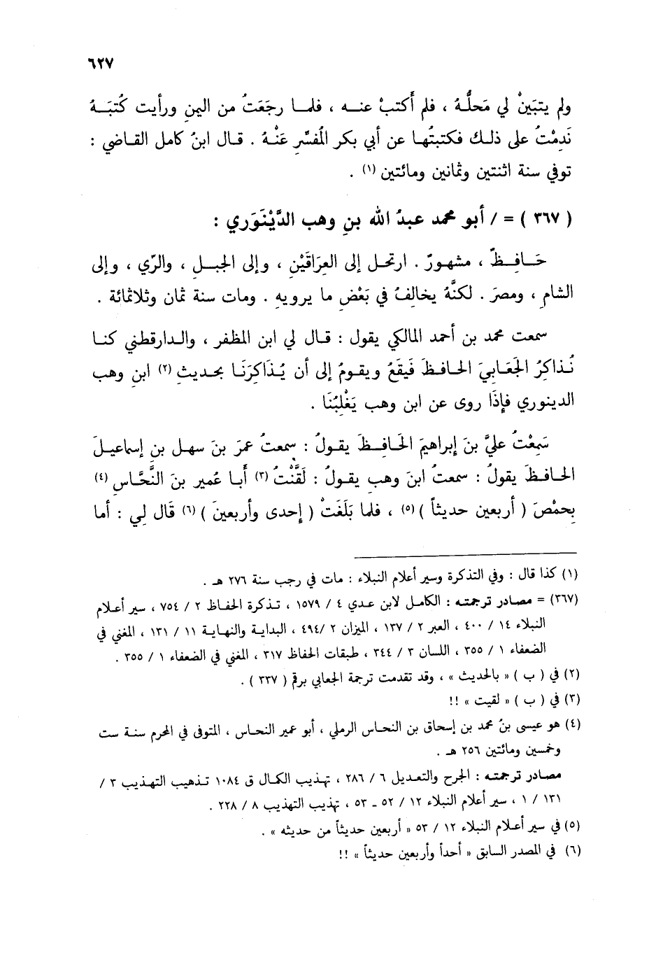 §أَبُو مُحَمَّدٍ عَبْدُ اللَّهِ بْنُ وَهْبٍ الدَّيْنَوَرِيُّ حَافِظٌ، مَشْهُورٌ، ارْتَحَلَ إِلَى الْعِرَاقَيْنِ، وَإِلَى الْجَبَلِ، وَالرَّيِّ، وَإِلَى الشَّامِ، وَمِصْرَ، لَكِنَّهُ يُخَالِفُ فِي بَعْضِ مَا يَرْوِيهِ، وَمَاتَ سَنَةَ ثَمَانٍ وَثَلَاثِمِائَةٍ. سَمِعْتُ مُحَمَّدَ بْنَ أَحْمَدَ الْمَالِكِيَّ يَقُولُ: قَالَ لِيَ ابْنُ الْمُظَفَّرُ، وَالدَّارَقُطْنِيُّ: كُنَّا نُذَاكِرُ الْجِعَابِيَّ الْحَافِظَ، فَيَقَعُ وَيَقُومُ إِلَى أَنْ يُذَاكِرَنَا بِحَدِيثِ ابْنِ وَهْبٍ الدَّيْنَوَرِيِّ، فَإِذَا رَوَى عَنِ ابْنِ وَهْبٍ يَغْلِبُنَا سَمِعْتُ عَلِيَّ بْنَ إِبْرَاهِيمَ الْحَافِظَ يَقُولُ: سَمِعْتُ عُمَرَ بْنَ سَهْلِ بْنِ إِسْمَاعِيلَ الْحَافِظَ يَقُولُ: سَمِعْتُ ابْنَ وَهْبٍ يَقُولُ: لَقَّنْتُ أَبَا عُمَيْرِ بْنِ النَّحَّاسِ بِحِمْصَ أَرْبَعِينَ حَدِيثًا، فَلَمَّا بَلَغَتْ إِحْدَى وَأَرْبَعِينَ قَالَ لِي: أَمَا -[628]- تَسْتَحْي أَتَجْشَمُنِي أَنْ أَشْهَدَ عَلَى رَسُولِ اللَّهِ صَلَّى اللهُ عَلَيْهِ وَسَلَّمَ فِي مَجْلِسٍ وَاحِدٍ أَكْثَرَ مِنْ أَرْبَعِينَ شَهَادَةً