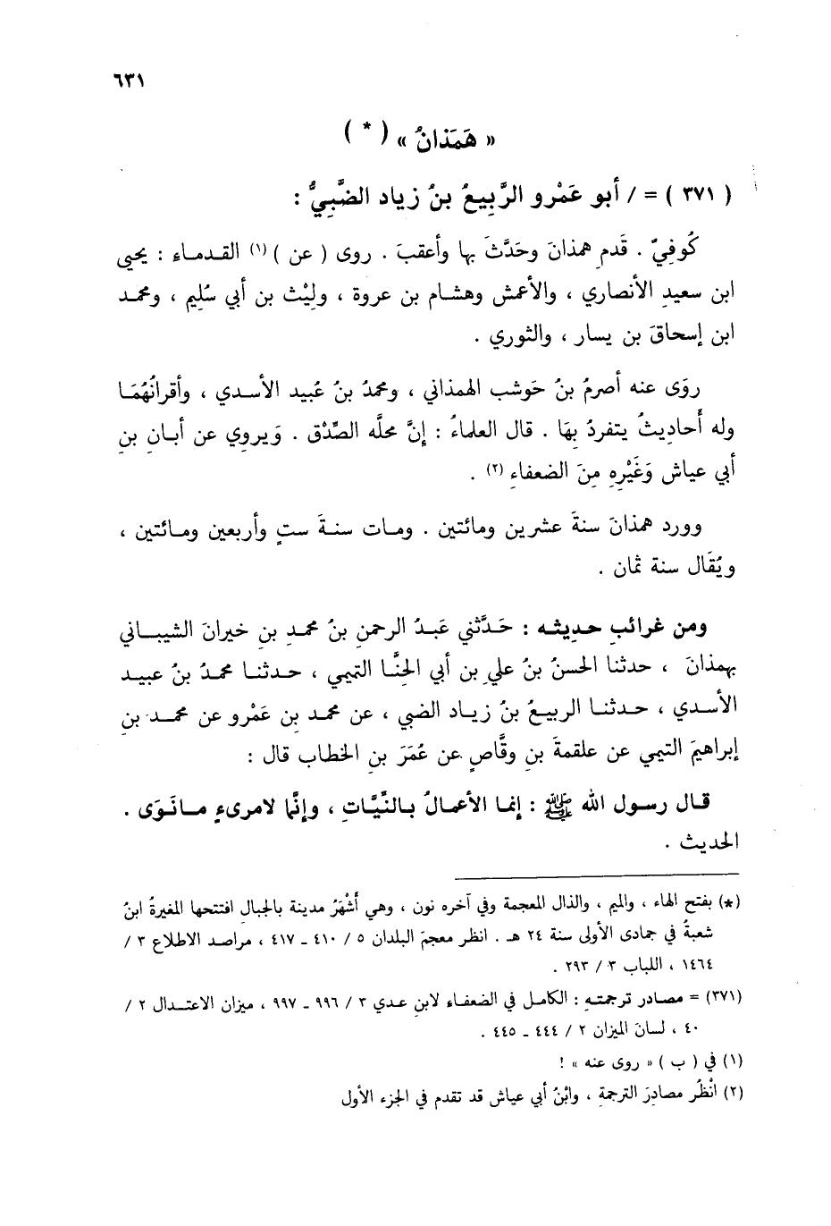 وَمِنْ غَرَائِبِ حَدِيثِهِ حَدَّثَنِي عَبْدُ الرَّحْمَنِ بْنُ مُحَمَّدِ بْنِ خَيْرَانَ الشَّيْبَانِيُّ بِهَمَذَانَ، حَدَّثَنَا الْحَسَنُ بْنُ عَلِيِّ بْنِ أَبِي الْحِنَّا التَّمِيمِيُّ، حَدَّثَنَا مُحَمَّدُ بْنُ عُبَيْدٍ الْأَسَدِيُّ، حَدَّثَنَا الرَّبِيعُ بْنُ زِيَادٍ الضَّبِّيُّ، عَنْ مُحَمَّدِ بْنِ عَمْرٍو، عَنْ مُحَمَّدِ بْنِ إِبْرَاهِيمَ التَّيْمِيِّ، عَنْ عَلْقَمَةَ بْنِ وَقَّاصٍ، عَنْ عُمَرَ بْنِ الْخَطَّابِ، قَالَ: قَالَ رَسُولُ اللَّهِ صَلَّى اللهُ عَلَيْهِ وَسَلَّمَ: «إِنَّمَا §الْأَعْمَالُ بِالنِّيَّاتِ , وَإِنَّمَا لِامْرِئٍ مَا نَوَى» الْحَدِيثُ -[632]- تَفَرَّدَ بِهِ الرَّبِيعُ، عَنْ مُحَمَّدِ بْنِ عَمْرٍو، عَنْ عَلْقَمَةَ. وَالْمَحْفُوظُ هَذَا مِنْ حَدِيثِ يَحْيَى بْنِ سَعِيدٍ الْأَنْصَارِيِّ، عَنْ مُحَمَّدِ بْنِ إِبْرَاهِيمَ التَّيْمِيِّ وَعِنْدَ الرَّبِيعِ لِهَذَا أَخَوَاتٌ
